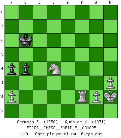 Last move : 1-0 2010 April 20 9:30:59 [Event "FICGS__CHESS__RAPID_E__000025"] [Site "FICGS"] [Date "2010.03.28"] [Round "1"] [White "Gramajo,Francisco"] [Black "Quanter,Kirsty"] [Result "1-0"] [WhiteElo "1250"] [BlackElo "1071"] 1.e4 c5 2.Bb5 a6 3.Bc4 f6 4.Nf3 b5 5.Bd5 Ra7 6.Bxg8 Rxg8 7.d4 c4 8.e5 fxe5 9.dxe5 Bb7 10.Be3 Bxf3 11.Qxf3 Rc7 12.Bb6 e6 13.O-O Bc5 14.Bxc7 Qxc7 15.Qh5+ Kf8 16.Nd2 g6 17.Qh6+ Rg7 18.Rae1 Nc6 19.Re4 Nxe5 20.Qf4+ Rf7 21.Qh6+ Ke7 22.Rfe1 Bb4 23.Rxe5 c3 24.Qg5+ Ke8 25.bxc3 Bxc3 26.Rc5 Rf5 27.Rxf5 gxf5 28.Qh5+ Kd8 29.Qg5+ Kc8 30.Rd1 Qe5 31.Nf3 Qe2 32.Rd3 Be1 33.h3 Bxf2+ 34.Kh2 Qxc2 35.Qg8+ Kc7 36.Rd2 Qc5 37.Qxh7 a5 38.Qxd7+ Kb8 39.Qd8+ Kb7 40.Rd7+ Ka6 41.Rd6+ Kb7 42.Qe7+ Qc7 43.Qxc7+ Kxc7 44.Rxe6 b4 45.Rf6 a4 46.Rxf5 Kc6 47.Nd4+ Kb6 48.Rxf2 1-0 Sicilian defense Kingside Castling by player White (move 13) 10 pieces endgame at move 46 : White KRNPPP , Black KBPP WHITE : King + 1 Rook 1 Knight 3 Pawns BLACK : King + 1 Bishop 2 Pawns 9 pieces endgame at move 48 : White KRNPPP , Black KPP WHITE : King + 1 Rook 1 Knight 3 Pawns BLACK : King + 2 Pawns Player White won this chess game. Follow this game move after move (download)By playing at Chess then, we may learn: First: Foresight... Second: Circumspection... Third: Caution... And lastly, we learn by Chess the habit of not being discouraged by present bad appearances in the state of our affairs, the habit of hoping for a favorable chance, and that of persevering in the secrets of resources. (Benjamin Franklin) Die Partien sind immer verschieden, die Interviews immer die gleichen. (Garry Kasparov) Cuando me preguntan: -¿Cual es el secreto que te hace hacer mejores movidas que tus oponentes?, Yo respondo: Me da gusto que me pregunten eso, porque, como veran, hay una simple razón. Yo pienso mis propias movidas y dejo a mi oponente que el piense las suyas. (Alexander Alekhine) Nous vivons dans un monde échiquéen : chaque jour qui passe est un défi à relever. (Philosophe Sasha) To send light into the darkness of men's hearts - such is the duty of the artist. (Schumann)