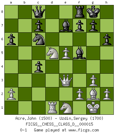 Last move : 0-1 2007 February 7 21:21:39 [Event "FICGS__CHESS__CLASS_D__000015"] [Site "FICGS"] [Date "2006.10.23"] [Round "1"] [White "Acre,John"] [Black "Uzdin,Sergey"] [Result "0-1"] [WhiteElo "1500"] [BlackElo "1700"] 1.d4 d5 2.Nf3 Nf6 3.c4 e6 4.g3 dxc4 5.Bg2 a6 6.O-O Nc6 7.e3 Bd7 8.Qe2 b5 9.Rd1 Bd6 10.e4 e5 11.dxe5 Bxe5 12.Nc3 O-O 13.Bg5 h6 14.Bxf6 Bxf6 15.e5 Be7 16.Ne1 Qc8 17.Qe4 Be8 18.b3 Rb8 19.bxc4 bxc4 20.Nd5 Ba3 21.Rab1 Rxb1 22.Rxb1 Bd7 23.Qe3 Bf5 24.Rd1 Be7 0-1 Queen's pawn game Kingside Castling by player White (move 6) Kingside Castling by player Black (move 12) Player Black won this chess game. Follow this game move after move (download)The chessboard is the world, the pieces are the phenomena of the Universe, the rules of the game are what we call the laws of Nature and the player on the other side is hidden from us. (Thomas Huxley) Kasparov stellt für gewöhnlich die Regeln auf und bricht sie dann selbst wieder. (Alexej Shirov) Un jugador que es sorprendido, esta derrotado a medias. (Proverbio) Tout change constamment, y compris dans le monde des Echecs. (Botvinnik) Life is the sum of all your choices. (Albert Camus)