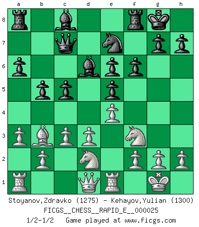 Last move : 1/2-1/2 2010 March 30 20:52:21 [Event "FICGS__CHESS__RAPID_E__000025"] [Site "FICGS"] [Date "2010.03.28"] [Round "1"] [White "Stoyanov,Zdravko"] [Black "Kehayov,Yulian"] [Result "1/2-1/2"] [WhiteElo "1275"] [BlackElo "1300"] 1.e4 c5 2.Nf3 Nc6 3.Bb5 Qc7 4.d3 Ne5 5.Bf4 f6 6.c3 a6 7.Bc4 e6 8.O-O b5 9.Bb3 d6 10.Bxe5 dxe5 11.a3 Bd6 12.Nbd2 Ne7 13.Re1 O-O 1/2-1/2 Sicilian : Nimzovich-Rossolimo attack (without ...d6) Kingside Castling by player White (move 8) Kingside Castling by player Black (move 13) This chess game ended in a draw. Follow this game move after move (download)Chess mastery essentially consists of analyzing Chess positions accurately. (Mikhail Botvinnik) Meine Liebe ist Schach, Schach, Schach. Ich muss jeden Tag Schach spielen, deshalb fühle ich mich so stark. (Miguel Najdorf) Haz el enroque temprano y seguido. (Rob Sillars) L'attaque fait le spectacle, la défense gagne les matchs. (Dicton footballistique) Gambling : The sure way of getting nothing from something. (Wilson Mizner)