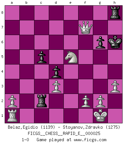 Last move : 1-0 2010 May 5 20:0:13 [Event "FICGS__CHESS__RAPID_E__000025"] [Site "FICGS"] [Date "2010.03.28"] [Round "1"] [White "Belaz,Egidio"] [Black "Stoyanov,Zdravko"] [Result "1-0"] [WhiteElo "1139"] [BlackElo "1275"] 1.e4 c5 2.Bc4 e6 3.Nf3 d5 4.exd5 exd5 5.Bb5+ Bd7 6.Bxd7+ Qxd7 7.O-O Nf6 8.d3 h6 9.Nc3 Nc6 10.Re1+ Be7 11.Ne5 Nxe5 12.Rxe5 O-O 13.Bf4 d4 14.Nb5 Ng4 15.Rxe7 Qxe7 16.Qxg4 Rfe8 17.h3 Rec8 18.Bxh6 g6 19.Bg5 Qe5 20.Bf4 Qe7 21.Bg5 Qe8 22.Nd6 Qf8 23.Nxb7 Rab8 24.Na5 Rxb2 25.Qh4 Rxc2 26.Bh6 Qe8 27.Qf6 Qf8 28.Bxf8 Rxf8 29.Nc6 Kh7 30.Nxa7 Ra8 31.Qxf7+ Kh6 32.Nc6 Rh8 33.Ne5 1-0 Sicilian defense Kingside Castling by player White (move 7) Kingside Castling by player Black (move 12) Player White won this chess game. Follow this game move after move (download)If cunning alone were needed to excel, women would be the best Chess players. (Albin) Am wohlsten fühle ich mich, wenn ich sehe, wie sich mein Gegner im Todeskampf windet. (Robert James Fischer) Uno por uno, yo los acribillé, mi superioridad muy pronto se volvio aparente. (Jose Capablanca) Avant la finale, les dieux ont créé le milieu de partie. (Tarrasch) Crush them ! Make them suffer ! (General Grievous in Star Wars ep.3)