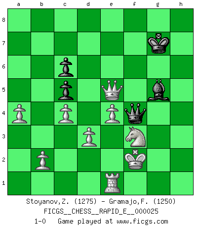 Last move : 1-0 2010 April 16 20:50:6 [Event "FICGS__CHESS__RAPID_E__000025"] [Site "FICGS"] [Date "2010.03.28"] [Round "1"] [White "Stoyanov,Zdravko"] [Black "Gramajo,Francisco"] [Result "1-0"] [WhiteElo "1275"] [BlackElo "1250"] 1.e4 e5 2.Nf3 Nc6 3.Bb5 d6 4.Bxc6+ bxc6 5.h3 Ba6 6.d3 g6 7.O-O Bg7 8.Be3 Nf6 9.Re1 O-O 10.Nc3 c5 11.Ne2 h5 12.c4 Bc8 13.Nc3 Be6 14.Ng5 Qd7 15.Nxe6 Qxe6 16.Nb5 Qd7 17.a4 c6 18.Nc3 a5 19.Ne2 Rae8 20.Bg5 Nh7 21.Be3 Nf6 22.Bg5 Nh7 23.Be3 f5 24.Nc3 f4 25.Bd2 g5 26.Ne2 g4 27.h4 Bf6 28.g3 fxg3 29.fxg3 Re7 30.Bxa5 Ref7 31.Bd2 Qe7 32.Bh6 Bxh4 33.Bxf8 Nxf8 34.Rf1 Bf6 35.Kg2 h4 36.gxh4 Ng6 37.h5 Nh4+ 38.Kg3 Rh7 39.Ng1 Nf3 40.Nxf3 Rxh5 41.Kxg4 Rh7 42.Rg1 Rg7+ 43.Kh3 Qd7+ 44.Kh2 Qf7 45.Rxg7+ Bxg7 46.Qf1 Qf4+ 47.Kg1 Qe3+ 48.Kg2 Bh6 49.Re1 Qf4 50.Kf2 Kf7 51.Qh3 Kf6 52.Qd7 Bg5 53.Qxd6+ Kg7 54.Qxe5+ 1-0 Ruy Lopez : Old Steinitz defense Kingside Castling by player White (move 7) Kingside Castling by player Black (move 9) Player White won this chess game. Follow this game move after move (download)Chess is the gymnasium of the mind. (Blaise Pascal) Kasparov ist eine Art Monster mit hundert Augen, denen auch nicht das Geringste entgeht. (Tony Miles) Cuando la partida de Ajedrez termina, el Peón y el Rey regresan a la misma caja. (Irish saying) La solitude du joueur d'Echecs à l'approche du mat est semblable à celle du condamné. (Francis Szpiner) Life is pain my dear and anyone who says otherwise is selling something. (Princess Bride)