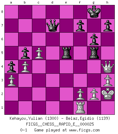 Last move : 0-1 2010 May 20 23:25:21 [Event "FICGS__CHESS__RAPID_E__000025"] [Site "FICGS"] [Date "2010.03.28"] [Round "1"] [White "Kehayov,Yulian"] [Black "Belaz,Egidio"] [Result "0-1"] [WhiteElo "1300"] [BlackElo "1139"] 1.d4 d5 2.e3 e6 3.Nf3 Nf6 4.c4 Bb4+ 5.Bd2 Bxd2+ 6.Qxd2 Ne4 7.Qd1 O-O 8.Nbd2 Nxd2 9.Qxd2 c6 10.c5 b6 11.b4 b5 12.a3 Bb7 13.Bd3 Nd7 14.O-O a5 15.h3 a4 16.Bc2 Nf6 17.Ne5 Nh5 18.Qd3 Nf6 19.Ng4 g6 20.Nxf6+ Qxf6 21.e4 dxe4 22.Qxe4 Rad8 23.Rad1 Rd7 24.Rd2 Re8 25.Qe3 Rde7 26.Qd3 e5 27.dxe5 Rxe5 28.Qd4 Qg5 29.Bd1 Rd5 30.Qg4 Qxd2 31.Bf3 Rg5 32.Qh4 Bc8 33.Kh2 R8e5 34.Bxc6 Bd7 35.Bxd7 Qxd7 0-1 Queen's pawn game Kingside Castling by player Black (move 7) Kingside Castling by player White (move 14) Player Black won this chess game. Follow this game move after move (download)A sacrifice is best refuted by accepting it. (Wilhelm Steinitz) Wenn Dein Gegner dir ein Remis anbietet, versuch herauszufinden, weshalb er glaubt schlechter zu stehen. (Nigel Short) El Ajedrez es el arte del análisis. (Mikhail Botvinnik) Ce qui est bien, c'est d'avoir tout un tas de pièces en prise : l'adversaire ne peut en prendre qu'une à la fois. Cité par Thierry Audin. I know the human being and fish can coexist peacefully. (George W. Bush, Saginaw sept. 29, 2000)