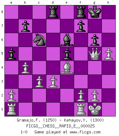 Last move : 1-0 2010 April 13 19:29:48 [Event "FICGS__CHESS__RAPID_E__000025"] [Site "FICGS"] [Date "2010.03.28"] [Round "1"] [White "Gramajo,Francisco"] [Black "Kehayov,Yulian"] [Result "1-0"] [WhiteElo "1250"] [BlackElo "1300"] 1.e4 e5 2.Nf3 d6 3.Bc4 Nf6 4.d3 c6 5.c3 d5 6.exd5 cxd5 7.Bb3 Bd6 8.Bg5 h6 9.Bh4 O-O 10.Bxd5 Be7 11.Bxf6 Bxf6 12.Be4 Qd6 13.Na3 Nc6 14.Nc4 Qe6 15.b4 Qg4 16.O-O Be7 17.Ne3 Bg5 18.Nxg4 Bxg4 19.h3 Be6 20.Nxg5 hxg5 21.Qh5 g6 22.Qxg5 Rad8 23.h4 a5 24.h5 1-0 Philidor's defense Kingside Castling by player Black (move 9) Kingside Castling by player White (move 16) Player White won this chess game. Follow this game move after move (download)By this measure (on the gap between Fischer & his contemporaries), I consider him the greatest world champion. (Garry Kasparov) Ich verstehe Aljechins Kombinationen ganz gut; aber woher er diese Angriffschancen bekommt und wie er die Eröffnung behandelt das ist für mich ein Buch mit sieben Siegeln. (Rudolf Spielmann) No solamente yo pronostico su triunfo sobre Botvinnik, sino que me adelanto y digo que probablemente Fischer es el jugador de Ajedrez mas grande que haya existido. (John Collins) Les échecs sont un jeu par leur forme, un art par leur essence et une science par sa difficulté d'acquisition. Ils peuvent vous procurer autant de plaisir qu'un bon livre ou une belle musique, mais vous n'aurez une réelle joie que si vous arrivez à bien jouer. (Tigran Petrosian) Wikichess, chess moves explained by 'experimented' players. (Thibault de Vassal)