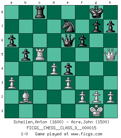 Last move : 1-0 2007 January 27 1:19:39 [Event "FICGS__CHESS__CLASS_D__000015"] [Site "FICGS"] [Date "2006.10.23"] [Round "1"] [White "Schellen,Anton"] [Black "Acre,John"] [Result "1-0"] [WhiteElo "1600"] [BlackElo "1500"] 1.b4 Nf6 2.Bb2 e6 3.a3 d5 4.e3 c5 5.bxc5 Bxc5 6.Nf3 O-O 7.c4 Nc6 8.d4 Be7 9.cxd5 exd5 10.Bd3 Bg4 11.O-O Qd7 12.Nbd2 Bf5 13.Nb3 Rac8 14.Rc1 Bxd3 15.Qxd3 Rfd8 16.Nc5 Bxc5 17.Rxc5 Ne4 18.Rc2 f6 19.Nd2 Qe6 20.Nxe4 dxe4 21.Qe2 Ne7 22.Rfc1 a6 23.Rc7 b5 24.R7c5 Rxc5 25.Rxc5 Rc8 26.Qh5 1-0 Polish (Sokolsky) opening Kingside Castling by player Black (move 6) Kingside Castling by player White (move 11) Player White won this chess game. Follow this game move after move (download)Bobby is the finest Chess player this country ever produced. His memory for the moves, his brilliance in dreaming up combinations, and his fierce determination to win are uncanny. (John Collins) Schach wird sich dank seiner hohen kulturellen Tradition immer durchsetzen. In näherer Zukunft womöglich sogar als Gegenreaktion auf die maßlose Reizüberflutung im Freizeit- und Spielbereich. (Garry Kasparov) Solo puedes ser bueno en el Ajedrez si amas al juego. (Bobby Fischer) Votre seul travail dans les ouvertures est d'obtenir un milieu de partie jouable. (Lajos Portish) The real danger is not that computers will begin to think like men, but that men will begin to think like computers. (Sydney J. Harris)