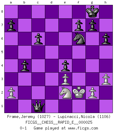 Last move : 0-1 2010 April 14 6:58:26 [Event "FICGS__CHESS__RAPID_E__000025"] [Site "FICGS"] [Date "2010.03.28"] [Round "1"] [White "Frame,Jeremy"] [Black "Lupinacci,Nicola"] [Result "0-1"] [WhiteElo "1027"] [BlackElo "1106"] 1.e4 e5 2.Nf3 Nf6 3.Nc3 Nc6 4.Bc4 Bc5 5.O-O O-O 6.d3 h6 7.Be3 Bxe3 8.fxe3 d6 9.d4 Bg4 10.h3 Bh5 11.Qe2 Bg6 12.dxe5 Nxe5 13.Nxe5 dxe5 14.Rad1 Qe7 15.Bd3 c6 16.Rd2 Rad8 17.Rfd1 b5 18.Qf2 b4 19.Ne2 Bxe4 20.Ng3 Bxd3 21.Rxd3 e4 22.Rxd8 Rxd8 23.Rxd8+ Qxd8 24.Ne2 Qd1+ 25.Qf1 Qxc2 26.Kf2 Qxb2 27.Qc1 Qxc1 0-1 Petrov Three knights game Kingside Castling by player White (move 5) Kingside Castling by player Black (move 5) Player Black won this chess game. Follow this game move after move (download)I still hope to kill Fischer. (Boris Spassky) Im Spitzenschach von heute geht es nur um Vorbereitung, um tiefgründige, sorgfältige Eröffnungsvorbereitung. (Nigel Short) La mitad de las variaciones que son calculadas en una partida de torneo, resultan ser completamente superfluas. Desafortunadamente, nadie sabe por adelantado cual mitad. (Jan Tinman) Si rien de grave n'est détecté lors de l'analyse d'une position, on joue alors le coup. Seconde règle de Blumenfeld. Everything in life is luck. (Donald Trump)