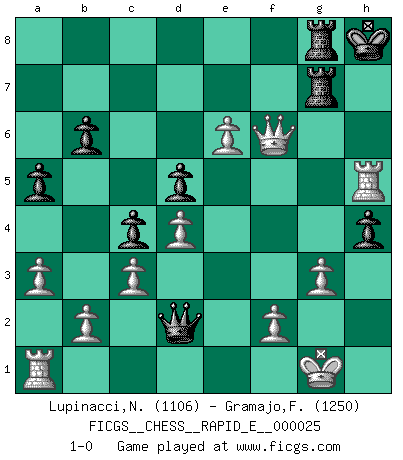 Last move : 1-0 2010 March 29 21:58:28 [Event "FICGS__CHESS__RAPID_E__000025"] [Site "FICGS"] [Date "2010.03.28"] [Round "1"] [White "Lupinacci,Nicola"] [Black "Gramajo,Francisco"] [Result "1-0"] [WhiteElo "1106"] [BlackElo "1250"] 1.e4 h6 2.d4 e6 3.Nf3 Bd6 4.Nc3 Ne7 5.a3 Ng6 6.Bd3 Bf4 7.e5 Nc6 8.Bxg6 Bxc1 9.Bxf7+ Kxf7 10.Qxc1 Rf8 11.O-O d5 12.Qf4+ Kg8 13.Qg4 Ne7 14.Ne2 b6 15.Nf4 Qe8 16.Nxe6 Bxe6 17.Qxe6+ Kh8 18.Qg4 c5 19.Rfd1 c4 20.c3 g5 21.h4 Rg8 22.hxg5 Ng6 23.Re1 a5 24.e6 Ra7 25.Nh4 Rag7 26.Nxg6+ Qxg6 27.g3 h5 28.Qf3 Qxg5 29.Re5 Qd2 30.Qf6 h4 31.Rh5+ 1-0 Carr's defense Kingside Castling by player White (move 11) Player White won this chess game. Follow this game move after move (download)Chess teaches you to control the initial excitement you feel when you see something that looks good and it trains you to think objectively when you're in trouble. (Stanley Kubrick) Ein typischer, sehr verbreiteter Gedankenschädling ist der, daß der betreffende Amateur von der Annanhme ausgeht, daß jeder einzelne Zug etwas zu leisten habe. (Aaron Nimzowitsch) Desconfianza es la característica mas necesaria de un jugador de Ajedrez. (Siegbert Tarrasch) J'ai vu le vaincu d'Echecs jouer des années durant dans l'espoir de la fête de la victoire. Car tu es plus riche de ce qu'elle existe si même elle n'est point pour toi. Ainsi de la perle du fond des mers. (Antoine de Saint-Exupéry) Imagination is more important than knowledge. Knowledge is limited. Imagination encircles the world. (Albert Einstein)