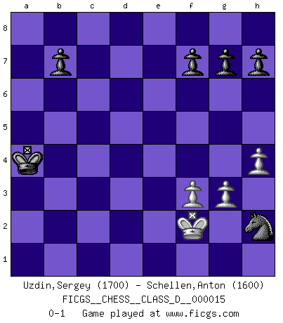 Last move : 0-1 2007 February 21 1:13:39 [Event "FICGS__CHESS__CLASS_D__000015"] [Site "FICGS"] [Date "2006.10.23"] [Round "1"] [White "Uzdin,Sergey"] [Black "Schellen,Anton"] [Result "0-1"] [WhiteElo "1700"] [BlackElo "1600"] 1.e4 e5 2.Nf3 Nc6 3.Nc3 Nf6 4.Nxe5 Nxe5 5.d4 Ng6 6.e5 Ng8 7.Bc4 d5 8.Bxd5 N8e7 9.Bb3 Nf5 10.Ne2 c5 11.c3 cxd4 12.Nxd4 Bc5 13.Ba4+ Kf8 14.O-O Bxd4 15.cxd4 Qxd4 16.Bd2 Be6 17.Bc3 Qxd1 18.Rfxd1 Nf4 19.Rd2 Nd5 20.Ba5 Ke7 21.Bb3 Nb6 22.Bb4+ Ke8 23.Bc2 Ne7 24.b3 Rd8 25.Rxd8+ Kxd8 26.Rd1+ Nbd5 27.Be4 Kc7 28.Bd6+ Kb6 29.Rd4 a5 30.b4 Rc8 31.g3 Nc3 32.bxa5+ Ka7 33.Bf3 Nf5 34.Rd2 Nxd6 35.exd6 Rd8 36.a3 Nb5 37.a4 Nxd6 38.Be2 Rd7 39.Kg2 Nf5 40.Rb2 Bd5+ 41.Kf1 Nd4 42.Bd3 Nf3 43.h4 Re7 44.Be2 Nh2+ 45.Ke1 Bf3 46.a6 Rxe2+ 47.Rxe2 Bxe2 48.Kxe2 Kxa6 49.f3 Ka5 50.Kf2 Kxa4 0-1 Four knights : Schultze-Mueller gambit Kingside Castling by player White (move 14) 10 pieces endgame at move 50 : White KPPP , Black KNPPPP WHITE : King + 3 Pawns BLACK : King + 1 Knight 4 Pawns Player Black won this chess game. Follow this game move after move (download)He who fears an isolated Queen's Pawn should give up Chess. (Siegbert Tarrasch) Schach ist ein Teil der Kultur, und wenn es mit der Kultur abwärts geht, geht es auch mit dem Schach abwärts. (Mikhail Moiseyevich Botvinik) El Ajedrez es un expediente tonto que hace creer a la gente inactiva que hacen una cosa muy astuta cuando solamente estan perdiendo su tiempo. (George Bernard Shaw) Il s'avisa de me proposer d'apprendre les échecs qu'il jouait un peu... me voilà forcené des échecs. J'achète un échiquier, je m'enferme dans ma chambre, j'y passe des jours et des nuits à vouloir apprendre par cur toutes les parties. (Jean-Jacques Rousseau, Confessions) Just because you do not take an interest in politics doesn't mean politics won't take an interest in you. (Pericles 430 B.C.)