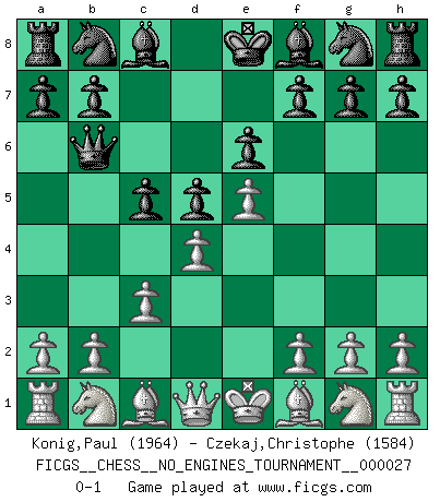 Last move : 0-1 2010 April 6 21:28:41 [Event "FICGS__CHESS__NO_ENGINES_TOURNAMENT__000027"] [Site "FICGS"] [Date "2010.03.29"] [Round "1"] [White "Konig,Paul"] [Black "Czekaj,Christophe"] [Result "0-1"] [WhiteElo "1964"] [BlackElo "1584"] 1.e4 e6 2.d4 d5 3.e5 c5 4.c3 Qb6 0-1 French : Advance variation Player Black won this chess game. Follow this game move after move (download)Chess is a part of culture and if a culture is declining then Chess too will decline. (Mikhail Botvinnik) Das Schachspiel hat wie die Liebe, die Musik, die Fähigkeit, den Menschen glücklich zu machen. Ich habe ein leises Gefühl des Bedauerns für jeden, der das Schachspiel nicht kennt, so wie ich jeden bedaure, der die Liebe nicht kennt. (Siegbert Tarrasch) El Ajedrez es el arte del análisis. (Mikhail Botvinnik) L'attaque fait le spectacle, la défense gagne les matchs. (Dicton footballistique) I've lost money so fast in these clubs it's left me reeling. I've read every poker book ever written, but the only way to get better at the game is to go out and play with people who are really good. The problem is, you stand to lose a lot of money doing it. (Matt Damon)