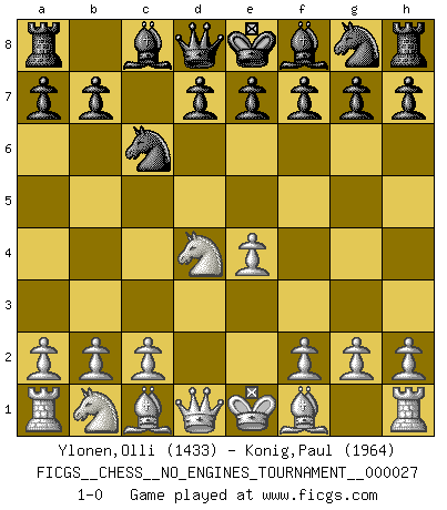 Last move : 1-0 2010 April 8 23:38:8 [Event "FICGS__CHESS__NO_ENGINES_TOURNAMENT__000027"] [Site "FICGS"] [Date "2010.03.29"] [Round "1"] [White "Ylonen,Olli"] [Black "Konig,Paul"] [Result "1-0"] [WhiteElo "1433"] [BlackElo "1964"] 1.e4 c5 2.Nf3 Nc6 3.d4 cxd4 4.Nxd4 1-0 Sicilian defense Player White won this chess game. Follow this game move after move (download)The battle for the ultimate truth will never be won. And that's why Chess is so fascinating. (Hans Kmoch) Die jungen Leute sollen verstehen, dass sie noch etwas von mir lernen können und müssen. (Viktor Kortschnoi) Yo adoro todas la posiciones. Denme una partida posicional difícil, y la jugaré. Pero posiciones totalmente ganadas, no las tolero. (Hein Donner) Ce qui est bien, c'est d'avoir tout un tas de pièces en prise : l'adversaire ne peut en prendre qu'une à la fois. Cité par Thierry Audin. In God we trust, all others we virus scan. (Anonymous)