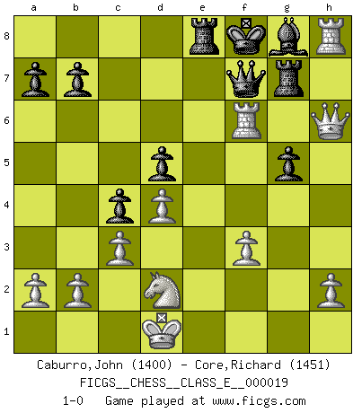 Last move : 1-0 2007 January 28 1:42:23 [Event "FICGS__CHESS__CLASS_E__000019"] [Site "FICGS"] [Date "2006.10.25"] [Round "1"] [White "Caburro,John"] [Black "Core,Richard"] [Result "1-0"] [WhiteElo "1400"] [BlackElo "1451"] 1.d4 d5 2.Bf4 e6 3.Nf3 Nd7 4.e3 Ne7 5.Bd3 c5 6.c3 Nf5 7.Nbd2 Be7 8.Qc2 O-O 9.g4 Nh4 10.Bxh7+ Kh8 11.Bd3 Ng2+ 12.Ke2 Nxf4+ 13.exf4 c4 14.Bh7 Nf6 15.Ng5 Nxg4 16.Rag1 f6 17.Rxg4 e5 18.Rh4 fxg5 19.Bg8 Kxg8 20.Qh7+ Kf7 21.Rh6 Bf6 22.fxe5 Bg4+ 23.f3 Be6 24.exf6 Rg8 25.Qg6+ Kf8 26.fxg7+ Rxg7 27.Qh5 Qe7 28.Kd1 Bf7 29.Rh8+ Bg8 30.Re1 Qd7 31.Qh6 Qf7 32.Re6 Re8 33.Rf6 1-0 Queen's pawn, Mason variation Kingside Castling by player Black (move 8) Player White won this chess game. Follow this game move after move (download)If a ruler does not understand Chess, how can he rule over a kingdom ? (King Khusros II) Stelle das Brett so, daß die Sonne in die Augen deines Gegners scheint. (Ruy López) Nunca antes ha habido un jugador de Ajedrez con tal conocimiento a fondo de las complejidades del juego y una inmensa voluntad absolutamente indomable de ganar. Yo pienso que Fischer es el jugador mas grande que jamás haya existido. (Lisa Lane) Aux échecs, les retours au sommet sont rares : les dommages psychologiques consécutifs à une défaite sont trop sévères. (Daily Telegraph) Vladimir Ras-Putin is still alive... He is also a good actor, I saw him in the Lord of the Rings. (Rodolfo d'Ettorre)