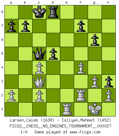 Last move : 1-0 2010 July 28 21:48:9 [Event "FICGS__CHESS__NO_ENGINES_TOURNAMENT__000027"] [Site "FICGS"] [Date "2010.03.29"] [Round "1"] [White "Larsen,Caleb"] [Black "Isliyen,Mehmet"] [Result "1-0"] [WhiteElo "1638"] [BlackElo "1452"] 1.e4 e5 2.Nf3 Nc6 3.Bb5 d6 4.d4 Bd7 5.O-O g6 6.Nc3 Bg7 7.dxe5 Nxe5 8.Nxe5 Bxe5 9.Bxd7+ Qxd7 10.f4 Bxc3 11.bxc3 O-O-O 12.Qd4 c5 13.Qxh8 h5 14.c4 Ne7 15.Qc3 h4 16.Be3 h3 17.g3 Qc6 18.Rae1 Qxe4 19.Rf2 Qc6 20.Bxc5 Qxc5 21.Rxe7 d5 22.Re1 1-0 Ruy Lopez : Old Steinitz defense Kingside Castling by player White (move 5) Queenside Castling by player Black (move 11) Player White won this chess game. Follow this game move after move (download)The isolated Pawn casts gloom over the entire chessboard. (Aaron Nimzovich) Ich kämpfe solange mein Gegner einen Fehler machen kann. (Emanuel Lasker) Después de una mala apertura, hay una esperanza en el juego medio. Pero una vez que estas en finales, el momento de la verdad ha llegado. (Edmar Mednis) Des combinaisons [dans le jeu d'échecs] pareilles à des mélodies. Je crois entendre pour ainsi dire la musique des coups... (Vladimir Nabokov) It is not true that people stop pursuing dreams because they grow old, they grow old because they stop pursuing dreams. (Gabriel Garcia Marquez)