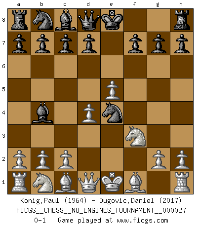 Last move : 0-1 2010 April 4 3:26:46 [Event "FICGS__CHESS__NO_ENGINES_TOURNAMENT__000027"] [Site "FICGS"] [Date "2010.03.29"] [Round "1"] [White "Konig,Paul"] [Black "Dugovic,Daniel"] [Result "0-1"] [WhiteElo "1964"] [BlackElo "2017"] 1.e4 e5 2.f4 Bc5 3.Nf3 Nf6 4.fxe5 Nxe4 5.d4 Bb4+ 0-1 KGD : Classical variation Player Black won this chess game. Follow this game move after move (download)It is not a move, even the best move that you must seek, but a realizable plan. (Eugene Znosko-Borovsky) Ich bin stolz ein Bulgare zu sein. (Veselin Topalov) Todos los Maestros de Ajedrez fueron un día unos principiantes. (Chernev) L'action d'une oeuvre littéraire se déroule sur un champ de bataille. Les masques et les types du drame moderne correspondent aux pièces du jeu d'échecs. L'intrigue correspond aux coups et aux gambits, c'est à dire aux techniques du jeu telles qu'utilisées et interprétées par les joueurs. Les tactiques et les péripéties [mouvements] correspondent aux coups exécutés par l'adversaire. (Viktor Shklovsky) When it is a question of money, everybody is of the same religion. (Voltaire)