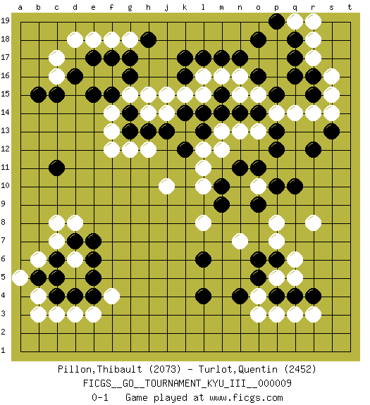 Last move : 0-1 2010 May 31 15:53:7 [Event "FICGS__GO__TOURNAMENT_KYU_III__000009"] [Site "FICGS"] [Date "2010.03.29"] [Round "1"] [Black "Pillon,Thibault"] [White "Turlot,Quentin"] [Result "0-1"] [Rating 1 "2073"] [Rating 2 "2452"] 1.q16 f4 2.d16 q6 3.d4 d6 4.e5 c3 5.p4 r3 6.c4 d3 7.e6 b4 8.e4 e3 9.b5 b3 10.d7 c7 11.c6 d8 12.e7 c8 13.c11 b6 14.c5 a5 15.k16 p3 16.q10 r14 17.r15 q14 18.o16 r17 19.q17 s15 20.r16 s16 21.s13 s14 22.r12 r18 23.q18 d18 24.e17 c16 25.c15 c17 26.b15 e18 27.f17 f18 28.g17 g18 29.h18 r8 30.q4 q3 31.r4 o4 32.p6 p5 33.o5 q5 34.n4 o3 35.l6 p8 36.o6 p7 37.l4 n7 38.o14 q19 39.p19 r19 40.o18 o10 41.p12 o13 42.p13 p14 43.o11 n13 44.n11 o15 45.n14 n15 46.m14 n16 47.n17 l15 48.p15 l16 49.l17 k15 50.k17 m13 51.l14 l12 52.k14 j15 53.k12 l11 54.m10 l10 55.m9 j10 56.h13 l8 57.p10 h14 58.j13 f14 59.g13 f13 60.g14 g15 61.f15 f12 62.g16 h15 63.e15 g12 64.l13 m12 65.o9 h12 66.m15 m16 67.m17 j14 0-1 Here are the names of the openings (joseki) played in the four corners : Corner d4 : f4 d4 Ootakamoku (Chaogao) 6-4 Point. The large takamoku (high) point (6-4), experimented with during the "new fuseki" movement in Japan in the 1930's. This point is seldom played as the initial corner point nowadays. Corner q4 : q6 p4 Ootakamoku (Chaogao) 6-4 Point. The large takamoku (high) point (6-4), experimented with during the "new fuseki" movement in Japan in the 1930's. This point is seldom played as the initial corner point nowadays. Corner q16 : q16 r14 Hoshi (Hwajeom, Seongjeom, Xingwei`) 4-4 Point. The star or hoshi (4-4) point, emphasizing influence at the potential expense of territory. Ikken Kakari (Hankan Keolch'im, Yi Gua`jiao~, 1-Space Low Approach). White 2 is the standard approach move to the 4-4. Player White won this Go (weiqi, baduk) game. Follow this game move after move (download)Avoid the plate connection. (Anonymous) Once you start thinking you have nothing left to learn, you have everything to learn. (Steve Badget)
