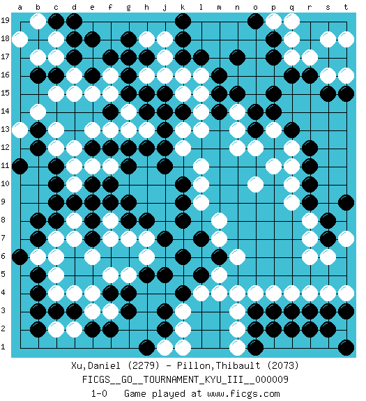 Last move : 1-0 2010 July 12 23:13:46 [Event "FICGS__GO__TOURNAMENT_KYU_III__000009"] [Site "FICGS"] [Date "2010.03.29"] [Round "1"] [Black "Xu,Daniel"] [White "Pillon,Thibault"] [Result "1-0"] [Rating 1 "2279"] [Rating 2 "2073"] 1.q16 d4 2.q3 d16 3.r9 n4 4.k4 q4 5.r3 r4 6.p3 p4 7.o3 o4 8.r12 n3 9.s3 q10 10.r10 q11 11.r11 q9 12.g3 d10 13.k17 g5 14.k6 f3 15.f2 e3 16.g4 f5 17.h5 k15 18.n17 h16 19.c10 d11 20.c11 c12 21.b12 c13 22.b13 c15 23.c8 c6 24.b7 r17 25.r16 q17 26.p17 s16 27.s15 s18 28.p15 l16 29.l17 h18 30.j13 h6 31.j5 l13 32.j11 l11 33.k10 l10 34.k8 l9 35.k9 m7 36.p12 o10 37.e2 d2 38.c3 c2 39.b5 b6 40.a6 c5 41.b4 r8 42.s8 r7 43.s7 r6 44.b2 c4 45.b3 c7 46.b8 d8 47.d9 e9 48.c9 f8 49.b16 b14 50.d17 c17 51.e16 e17 52.d18 c18 53.c16 d15 54.e18 b17 55.f17 f16 56.g16 f15 57.h17 j17 58.g17 j16 59.g15 g14 60.f14 e15 61.h14 g13 62.g12 f13 63.h15 h13 64.h12 j14 65.j15 k16 66.k14 l14 67.m16 n2 68.o2 k2 69.m15 k13 70.j14 l15 71.p18 t16 72.t15 t18 73.k18 j18 74.d3 o12 75.o13 n12 76.f12 e13 77.j2 k3 78.j3 l4 79.l5 m4 80.g9 s4 81.t3 n13 82.o14 q12 83.q13 p11 84.c19 b19 85.d19 a18 86.g8 q1 87.q2 p1 88.o1 s1 89.r2 r1 90.s2 t4 91.p2 n1 92.t1 g7 93.j7 q18 94.m6 n6 95.l7 m8 96.f10 a13 97.a11 s6 98.g18 t7 99.t9 k12 100.j12 p13 101.p14 p19 102.o19 q19 103.k19 m5 104.f4 e4 105.e10 e11 106.e7 d7 107.e8 e6 108.f9 f7 109.e9 h7 110.h8 f11 111.e12 d12 112.g11 n14 113.n15 j1 114.h1 k1 115.m14 1-0 Here are the names of the openings (joseki) played in the four corners : Corner d4 : d4 g3 Hoshi (Hwajeom, Seongjeom, Xingwei`) 4-4 Point. The star or hoshi (4-4) point, emphasizing influence at the potential expense of territory. Niken Kakari (Dukan Keolch'im, E`r Gua`jiao~, 2-Space Low Approach). White typically answers by 7-3 or 3-5 (which is not joseki). Player Black won this Go (weiqi, baduk) game. Follow this game move after move (download)If you lose by one point, take a rest. (Anonymous) There will be no order, only chaos. (Sol Robeson in Pi by Darren Aronofsky)