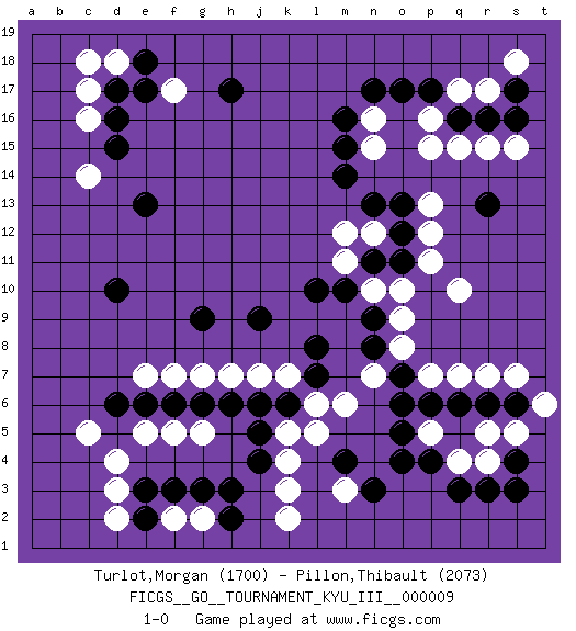 Last move : 1-0 2010 July 3 1:24:10 [Event "FICGS__GO__TOURNAMENT_KYU_III__000009"] [Site "FICGS"] [Date "2010.03.29"] [Round "1"] [Black "Turlot,Morgan"] [White "Pillon,Thibault"] [Result "1-0"] [Rating 1 "1700"] [Rating 2 "2073"] 1.r16 q4 2.d16 p16 3.n17 r17 4.s17 q17 5.r13 n16 6.m16 n15 7.o17 s15 8.s16 r15 9.q16 q15 10.p17 s18 11.m15 p15 12.m14 d4 13.d10 f17 14.h17 c17 15.d17 c16 16.d15 d18 17.e18 c18 18.e17 c14 19.e13 k3 20.r6 q10 21.o4 p5 22.r3 q7 23.q3 r4 24.s4 s5 25.s3 r5 26.p4 c5 27.q6 s7 28.p6 r7 29.s6 t6 30.o5 p7 31.o7 o8 32.n8 o9 33.n9 n10 34.m10 k7 35.j9 h7 36.g9 n7 37.o6 m11 38.n11 o10 39.l10 m12 40.n13 n12 41.o13 p13 42.o12 p12 43.o11 p11 44.f3 f5 45.h3 g2 46.h2 f2 47.e3 d3 48.e2 d2 49.g3 k2 50.j5 k5 51.j4 k4 52.j6 j7 53.k6 l6 54.l7 m6 55.m4 m3 56.n3 l5 57.l8 g5 58.g6 g7 59.f6 e7 60.e6 e5 61.h6 f7 62.d6 1-0 Here are the names of the openings (joseki) played in the four corners : Corner q16 : r16 p16 Komoku (Somok, Xiao~mu`) 3-4 Point. The komoku (3-4) point is the traditional corner enclosure move.. Ikken Takagakari (Hankan Nop'dakeolch'im, Yi Gaogua`jiao~, 1-Space High Approach). The 5-4 approach move has become more popular in modern times, as modern Go emphasizes speed and influence. Corner d16 : d16 f17 Hoshi (Hwajeom, Seongjeom, Xingwei`) 4-4 Point. The star or hoshi (4-4) point, emphasizing influence at the potential expense of territory. Ikken Kakari (Hankan Keolch'im, Yi Gua`jiao~, 1-Space Low Approach). White 2 is the standard approach move to the 4-4. Corner q4 : q4 r6 Hoshi (Hwajeom, Seongjeom, Xingwei`) 4-4 Point. The star or hoshi (4-4) point, emphasizing influence at the potential expense of territory. Ikken Kakari (Hankan Keolch'im, Yi Gua`jiao~, 1-Space Low Approach). Black 2 is the standard approach move to the 4-4. Player Black won this Go (weiqi, baduk) game. Follow this game move after move (download)Pon-nuki is worth thirty points. (Anonymous) There are two major products that came out of Berkeley: LSD and UNIX. We do not believe this is to be a coincidence. (Jeremy S. Anderson)