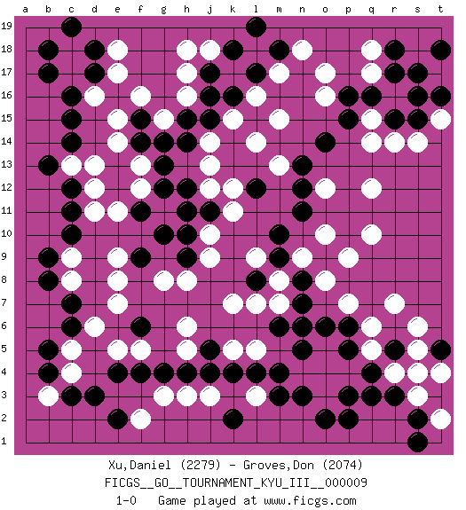 Last move : 1-0 2010 June 7 7:49:27 [Event "FICGS__GO__TOURNAMENT_KYU_III__000009"] [Site "FICGS"] [Date "2010.03.29"] [Round "1"] [Black "Xu,Daniel"] [White "Groves,Don"] [Result "1-0"] [Rating 1 "2279"] [Rating 2 "2074"] 1.q16 c5 2.q4 e17 3.k4 k17 4.c15 q10 5.d3 r7 6.c7 d6 7.f4 e8 8.c10 d11 9.c11 d12 10.c12 d13 11.f6 c13 12.b13 e15 13.c14 o16 14.k16 l16 15.l15 k15 16.j16 l14 17.l17 m15 18.k18 h17 19.j17 m17 20.m18 r14 21.r15 s14 22.s15 q15 23.p15 q14 24.r17 o3 25.p3 o5 26.r5 g8 27.m3 q6 28.r3 h6 29.j5 k7 30.h15 h16 31.j15 j14 32.h14 j13 33.p16 o17 34.o14 h18 35.n13 n18 36.l19 j18 37.g13 g11 38.f14 g15 39.f15 f16 40.h12 j12 41.h11 e14 42.j11 k11 43.g10 j9 44.f11 f12 45.f9 e11 46.g12 e7 47.h9 h8 48.n11 n9 49.b4 e9 50.b5 j10 51.h10 q18 52.r18 t15 53.s16 s6 54.o2 p4 55.n3 o4 56.p2 h5 57.h4 q12 58.l12 k12 59.m10 o12 60.n12 t17 61.s17 q17 62.t18 c4 63.c3 b3 64.c6 e5 65.e4 f5 66.d18 d16 67.c16 c17 68.b17 c18 69.b18 m13 70.m9 m8 71.l8 l9 72.n8 m7 73.o9 o8 74.n7 p9 75.m6 l7 76.n6 o10 77.t16 f13 78.g14 t4 79.t3 s3 80.t5 s4 81.s2 t2 82.s1 s5 83.d17 e18 84.c19 c8 85.b8 c9 86.b9 r4 87.q3 l5 88.n5 n4 89.m4 k5 90.p6 q5 91.p5 p7 92.o6 g3 93.g4 j3 94.j4 l3 95.l4 h3 96.e2 f2 97.k2 1-0 Here are the names of the openings (joseki) played in the four corners : Corner d16 : e17 c15 Mokuhazushi (Waemok, Wai`mu`) 5-3 Point. The mokuhazushi (5-3) point was popular in the Edo period in Japan (1600 - 1867). It emphasizes influence; territorially, it is inferior to the 3-4 point. Corner d4 : c5 d3 Mokuhazushi (Waemok, Wai`mu`) 5-3 Point. The mokuhazushi (5-3) point was popular in the Edo period in Japan (1600 - 1867). It emphasizes influence; territorially, it is inferior to the 3-4 point. Komoku Kakari. Black 2 is the standard approach because of its solidity and stability. Corner q4 : q4 r7 Hoshi (Hwajeom, Seongjeom, Xingwei`) 4-4 Point. The star or hoshi (4-4) point, emphasizing influence at the potential expense of territory. Niken Kakari (Dukan Keolch'im, E`r Gua`jiao~, 2-Space Low Approach). Black typically answers by 7-3 or 3-5 (which is not joseki). Corner q16 : q16 o16 Hoshi (Hwajeom, Seongjeom, Xingwei`) 4-4 Point. The star or hoshi (4-4) point, emphasizing influence at the potential expense of territory. Ikken Takagakari (Hankan Nop'dakeolch'im, Yi Gaojia, 1-Space High Approach). Black typically responds at 6-4 or 3-10. Black 4-10 is played when Black finds play on the right side advantageous. Black 4-8 or 3-8 may be played when Black has support at top. Player Black won this Go (weiqi, baduk) game. Follow this game move after move (download)The rectangular six is normally alive. (Anonymous) Luck never gives; it only lends. (Swedish proverb)