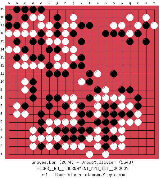 Last move : 0-1 2010 April 18 3:30:52 [Event "FICGS__GO__TOURNAMENT_KYU_III__000009"] [Site "FICGS"] [Date "2010.03.29"] [Round "1"] [Black "Groves,Don"] [White "Drouot,Olivier"] [Result "0-1"] [Rating 1 "2074"] [Rating 2 "2543"] 1.q15 d4 2.d17 p4 3.d15 c13 4.e13 j17 5.n3 o2 6.n5 r5 7.o3 p3 8.n2 p2 9.l17 f17 10.k15 h15 11.h13 j14 12.j16 h16 13.k17 j18 14.k13 j13 15.j12 h12 16.k12 g13 17.h11 g12 18.g11 e12 19.d13 d12 20.c14 b12 21.b13 c12 22.p6 q7 23.q6 r6 24.q9 p7 25.n7 r17 26.f3 c6 27.j4 d2 28.s15 p17 29.r8 o6 30.o5 p5 31.o7 j8 32.g8 g7 33.h7 h8 34.f8 j5 35.g6 j7 36.f7 h5 37.h4 g5 38.e5 f4 39.g4 f5 40.e4 e3 41.e2 d3 42.e6 g3 43.h3 f2 44.g2 f3 45.o16 o17 46.n16 k10 47.c7 b6 48.f11 c9 49.d8 b7 50.d9 c10 51.d10 k4 52.k3 h2 53.j3 l3 54.l4 k2 55.k5 j2 56.k4 m4 57.k6 j6 58.l2 m6 59.n6 m3 60.m5 m2 61.r7 q5 62.o6 m11 63.l11 n9 64.m9 m8 65.l10 n8 66.l8 m7 67.k7 p8 68.p9 o8 69.o11 n1 70.n4 l1 71.f12 l5 72.l6 o4 73.g14 h14 74.f14 e18 75.g18 d18 76.c18 b18 77.c19 c17 78.b17 c16 79.a18 b16 80.b19 d16 81.e16 f16 82.g17 h17 83.d19 e17 84.g16 g15 85.e19 f15 86.e15 a16 87.a17 b14 88.b15 a14 89.s17 s18 90.q17 q18 91.r16 q16 92.p16 t17 0-1 Here are the names of the openings (joseki) played in the four corners : Corner q4 : p4 n3 Takamoku (Gomok, Gaomu`) 5-4 Point. The takamoku (high) point (5-4). With its emphasis on influence, the 5-4 point complements the 4-4 (hoshi) point in creating an influence-oriented fuseki. Corner d4 : d4 f3 Hoshi (Hwajeom, Seongjeom, Xingwei`) 4-4 Point. The star or hoshi (4-4) point, emphasizing influence at the potential expense of territory. Ikken Kakari (Hankan Keolch'im, Yi Gua`jiao~, 1-Space Low Approach). Black 2 is the standard approach move to the 4-4. Player White won this Go (weiqi, baduk) game. Follow this game move after move (download)There are players who don't accept exchange: they play many moves that perpetuate a previous state of the game. (Pierre Audouard) All war is based on deception. (Sun Tzu)
