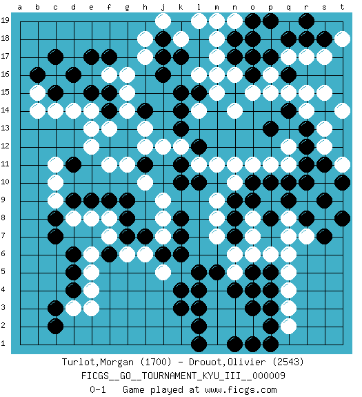 Last move : 0-1 2010 July 6 0:8:40 [Event "FICGS__GO__TOURNAMENT_KYU_III__000009"] [Site "FICGS"] [Date "2010.03.29"] [Round "1"] [Black "Turlot,Morgan"] [White "Drouot,Olivier"] [Result "0-1"] [Rating 1 "1700"] [Rating 2 "2543"] 1.d16 q4 2.d4 q17 3.r10 r7 4.r13 r15 5.o3 q3 6.k4 c14 7.f17 c9 8.c7 e14 9.k17 m17 10.k15 m3 11.k3 d3 12.c3 e3 13.c2 e4 14.d5 e5 15.n4 e6 16.d6 e8 17.b16 b15 18.c15 b14 19.d9 d8 20.c8 c10 21.o17 n16 22.o16 o15 23.q16 p16 24.p17 p15 25.q18 r17 26.r18 s17 27.n18 m18 28.s18 h17 29.j16 t18 30.p19 f16 31.f15 g15 32.f14 g14 33.e15 g16 34.e17 m19 35.n17 l16 36.n15 m16 37.j17 h18 38.k13 n14 39.g13 l14 40.k14 h13 41.h14 f13 42.g12 d14 43.c17 j19 44.f12 e13 45.g9 m4 46.m5 n5 47.o5 n6 48.l5 o2 49.p2 n2 50.p3 q2 51.o1 o6 52.p5 q6 53.l2 o4 54.p4 n3 55.n1 m1 56.p1 m2 57.l1 o4 58.d11 c11 59.n4 q11 60.r11 o4 61.l15 m15 62.n4 n19 63.o19 o4 64.q14 q15 65.n4 p18 66.o18 o4 67.k19 k18 68.n4 q19 69.r19 o4 70.j18 l19 71.n4 q12 72.o4 s12 73.r12 s13 74.s11 r14 75.r8 s8 76.p10 o11 77.p8 p6 78.l3 r9 79.q10 n10 80.n9 m9 81.n8 m8 82.o10 n11 83.n7 m7 84.s9 q8 85.t10 p9 86.q9 o8 87.o9 o7 88.r8 q7 89.s7 r9 90.p13 p11 91.r8 q5 92.l4 r9 93.s14 s15 94.r8 h12 95.h11 r9 96.t12 t14 97.r8 j12 98.k10 r9 99.t13 t11 100.r8 g11 101.t8 k12 102.l12 l11 103.k11 f11 104.e9 f8 105.f9 e12 106.g8 g6 107.g7 h6 108.k7 j8 109.k8 j7 110.l10 m11 111.j6 j9 112.h7 j5 113.k6 h10 114.f6 f7 0-1 Here are the names of the openings (joseki) played in the four corners : Corner q16 : q17 r13 Komoku (Somok, Xiao~mu`) 3-4 Point. The komoku (3-4) point is the traditional corner enclosure move.. Corner d16 : d16 c14 Hoshi (Hwajeom, Seongjeom, Xingwei`) 4-4 Point. The star or hoshi (4-4) point, emphasizing influence at the potential expense of territory. Ikken Kakari (Hankan Keolch'im, Yi Gua`jiao~, 1-Space Low Approach). White 2 is the standard approach move to the 4-4. Corner d4 : d4 c9 Hoshi (Hwajeom, Seongjeom, Xingwei`) 4-4 Point. The star or hoshi (4-4) point, emphasizing influence at the potential expense of territory. Player White won this Go (weiqi, baduk) game. Follow this game move after move (download)You have to like to win, and to learn to recognize the errors that gave you the victory. (Pierre Audouard) The man who strikes first admits that his ideas have given out. (Chinese proverb)