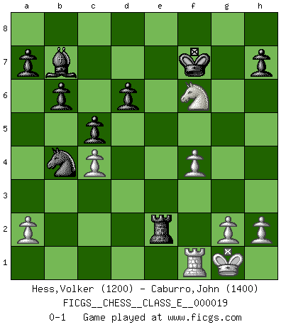 Last move : 0-1 2006 November 3 14:59:42 [Event "FICGS__CHESS__CLASS_E__000019"] [Site "FICGS"] [Date "2006.10.25"] [Round "1"] [White "Hess,Volker"] [Black "Caburro,John"] [Result "0-1"] [WhiteElo "1200"] [BlackElo "1400"] 1.e4 b6 2.d4 Bb7 3.Nc3 e6 4.Nf3 Bb4 5.Bd3 f5 6.O-O Bxc3 7.bxc3 fxe4 8.Ng5 exd3 9.Qxd3 Nf6 10.f4 O-O 11.Ba3 Re8 12.Rae1 Na6 13.c4 c5 14.d5 exd5 15.Rxe8+ Qxe8 16.Nf3 Qe4 17.Ne5 Qxd3 18.cxd3 dxc4 19.dxc4 d6 20.Nd3 Re8 21.Bb2 Re3 22.Bxf6 gxf6 23.Nf2 Nb4 24.Ng4 Re2 25.Nxf6+ Kf7 0-1 Owen defense Kingside Castling by player White (move 6) Kingside Castling by player Black (move 10) Player Black won this chess game. Follow this game move after move (download)Live, lose, and learn, by observing your opponent how to win. (Amber Steenbock) Drei Punkte vor allen anderen ist wie einer, der im weißen Anzug posiert, während der Rest in Müllsäcke gekleidet dasteht. (Viktor Kortschnoi) Hoy en día, si tu no eres un Gran Maestro a los 14 años, es mejor que lo olvides. (Anand Viswanathan) Pour moi, les échecs ne sont pas un jeu mais un art. (Alexandre Alekhine) Art is the triumph over chaos. (John Cheever)
