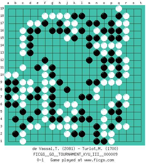 Last move : 0-1 2010 September 12 17:47:1 [Event "FICGS__GO__TOURNAMENT_KYU_III__000009"] [Site "FICGS"] [Date "2010.03.29"] [Round "1"] [Black "de Vassal,Thibault"] [White "Turlot,Morgan"] [Result "0-1"] [Rating 1 "2081"] [Rating 2 "1700"] 1.q4 c16 2.q16 d3 3.c5 c7 4.e5 f4 5.d7 d8 6.e7 c6 7.c3 c2 8.b4 c11 9.d4 e3 10.k4 o17 11.m17 q14 12.o16 n16 13.n17 r17 14.p17 r16 15.e16 e17 16.d16 d17 17.d14 c15 18.d15 c14 19.d13 c13 20.g16 o15 21.o18 r6 22.n15 n14 23.m15 p6 24.q10 r12 25.o10 o4 26.p5 o5 27.q6 q7 28.q5 r7 29.m9 q3 30.e11 g18 31.m14 j17 32.h17 h18 33.j16 k17 34.g5 h3 35.h4 j3 36.e8 d9 37.l7 j4 38.j5 k5 39.l5 k6 40.m4 k3 41.l4 f5 42.g6 f6 43.g7 f7 44.g8 f8 45.g10 f9 46.b2 c1 47.b6 g9 48.h9 k16 49.k15 f11 50.g11 f10 51.f12 j6 52.j8 h5 53.o14 r10 54.p3 r3 55.n3 o3 56.b8 c8 57.b9 b10 58.p13 q9 59.q11 j15 60.h16 r11 61.n2 o2 62.o1 p1 63.n1 p2 64.l2 q13 65.k2 j2 66.p12 n7 67.m7 n8 68.n9 p9 69.q15 r15 70.q18 r18 71.l18 b7 72.a7 a8 73.a9 c9 74.a8 a10 75.a6 p14 76.p15 o9 77.g4 g3 78.k18 j18 79.f17 f18 80.l16 p10 81.o11 p11 82.q12 o13 83.o12 o15 84.n13 o14 85.m12 q17 86.p16 q19 0-1 Comment by player 1 : Thibault de Vassal : 29.m9 is just a bad consequence of the touch-move option :( sorry about that... I wanted to play r5 of course... Here are the names of the openings (joseki) played in the four corners : Corner d4 : d3 c5 Komoku (Somok, Xiao~mu`) 3-4 Point. The komoku (3-4) point is the traditional corner enclosure move.. Ikken Kakari (Hankan Keolch'im, Yi Gua`jiao~, 1-Space Low Pincer). The small knight move is the basic approach move to the 3-4 point stone. It has been continually used for over four centuries. There are limitless variations, with new moves constantly being discovered. Black 2 opens the door to a treaure store of joseki. Corner q16 : q16 o17 Hoshi (Hwajeom, Seongjeom, Xingwei`) 4-4 Point. The star or hoshi (4-4) point, emphasizing influence at the potential expense of territory. Ikken Kakari (Hankan Keolch'im, Yi Gua`jiao~, 1-Space Low Approach). White 2 is the standard approach move to the 4-4. Corner q4 : q4 r6 Hoshi (Hwajeom, Seongjeom, Xingwei`) 4-4 Point. The star or hoshi (4-4) point, emphasizing influence at the potential expense of territory. Ikken Kakari (Hankan Keolch'im, Yi Gua`jiao~, 1-Space Low Approach). White 2 is the standard approach move to the 4-4. Player White won this Go (weiqi, baduk) game. Follow this game move after move (download)There is death in the hane. (Anonymous) The human is the only animal species whose members are able to talk themselves into difficulties that would not otherwise exist. (Wendell Johnson)