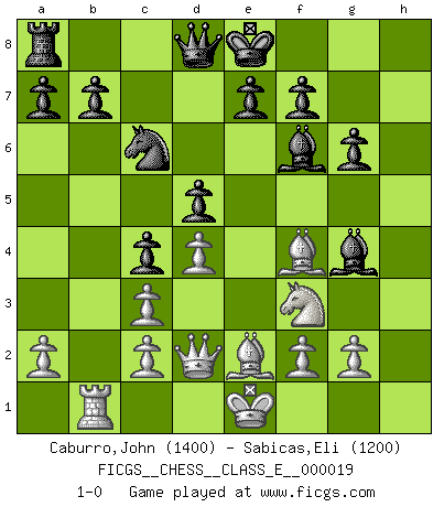 Last move : 1-0 2007 January 16 6:25:48 [Event "FICGS__CHESS__CLASS_E__000019"] [Site "FICGS"] [Date "2006.10.25"] [Round "1"] [White "Caburro,John"] [Black "Sabicas,Eli"] [Result "1-0"] [WhiteElo "1400"] [BlackElo "1200"] 1.d4 Nf6 2.e4 Nxe4 3.Bd3 d5 4.Nc3 Nxc3 5.bxc3 c5 6.Bf4 Nc6 7.Nf3 c4 8.Be2 g6 9.h4 Bg7 10.h5 Bg4 11.hxg6 hxg6 12.Rxh8+ Bxh8 13.Qd2 Bf6 14.Rb1 1-0 This chess game has been lost on time (started : 2006.10.25 2:8:4) Queen's pawn game Player White won this chess game. Follow this game move after move (download)Modern Chess is too much concerned with things like Pawn structure. Forget it, Checkmate ends the game. (Nigel Short) Wenn Schach ein enormer Dschungel ist, der seine Myriaden von Geheimnissen nicht preisgeben will, dann sind Computer die Kettensägen einer gewaltigen ökologisch unsensiblen Nutzholzfirma. (Nigel Short) El Ajedrez era la lengua materna de Capablanca. (Reti) Donnez-moi un Cavalier en 6e et je gagnerais toutes mes parties. (Steinitz) The faster the computer, the slower the brain. (Thibault de Vassal)