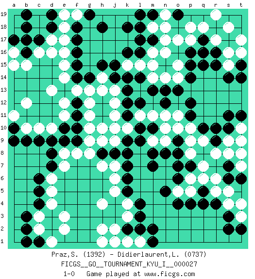 Last move : 1-0 2010 September 18 13:20:19 [Event "FICGS__GO__TOURNAMENT_KYU_I__000027"] [Site "FICGS"] [Date "2010.03.31"] [Round "1"] [Black "Praz,Sylvain"] [White "Didierlaurent,Ludovic"] [Result "1-0"] [Rating 1 "1392"] [Rating 2 "0737"] 1.r16 e3 2.q4 d16 3.c4 d4 4.c5 c3 5.b3 c2 6.d7 d10 7.f17 d13 8.k16 e7 9.d8 h4 10.q10 q7 11.o4 r5 12.r4 s4 13.s3 s5 14.r9 r8 15.l3 p17 16.q17 q18 17.p16 p18 18.r18 n16 19.m17 o17 20.p15 m14 21.k14 h7 22.f15 g10 23.k12 k3 24.l4 k4 25.k5 j5 26.k6 j6 27.k7 g13 28.o13 o14 29.p14 s9 30.s10 s8 31.n13 n14 32.m13 e18 33.f18 e17 34.o7 p6 35.o6 j9 36.l9 m18 37.l18 n18 38.k18 r19 39.o19 s18 40.s17 r17 41.c17 q16 42.q15 s16 43.r15 c16 44.d18 p8 45.c9 c10 46.b9 b10 47.a10 a11 48.a9 b12 49.b16 b15 50.b18 e19 51.d19 a16 52.b17 q9 53.r10 p10 54.p11 s15 55.s14 o10 56.t15 t17 57.k2 j2 58.l2 t3 59.s2 t10 60.s11 e8 61.d9 d6 62.c6 d5 63.e9 d17 64.b19 f19 65.h18 e14 66.e10 e11 67.j1 h2 68.b2 h14 69.h15 h1 70.c1 d1 71.b1 e2 72.g19 e15 73.f14 f13 74.j14 j12 75.k11 j11 76.f10 g9 77.f11 o11 78.p12 p5 79.p4 o5 80.n5 n9 81.m7 e12 82.k9 m16 83.l16 j13 84.j10 h10 85.j8 k10 86.h8 g8 87.l10 j10 88.a17 a15 89.q5 q6 90.f16 g11 91.g14 h13 92.t11 t9 93.t2 t4 94.m19 n19 95.l19 m11 96.o8 l11 97.k13 t16 98.t14 l15 99.o9 p9 100.l14 k15 101.j15 m15 102.n8 m9 103.m10 n10 104.m8 k1 105.n12 l1 106.m1 j1 107.m2 n11 108.f9 f8 109.f12 g12 110.p7 o15 111.l12 j7 112.l17 n17 113.s6 r6 114.s7 t7 115.t6 t8 116.q17 h9 117.k8 e16 118.q16 1-0 Here are the names of the openings (joseki) played in the four corners : Corner d4 : e3 c4 Mokuhazushi (Waemok, Wai`mu`) 5-3 Point. The mokuhazushi (5-3) point was popular in the Edo period in Japan (1600 - 1867). It emphasizes influence; territorially, it is inferior to the 3-4 point. Komoku Kakari. Black 2 is the standard approach because of its solidity and stability. Corner d16 : d16 f17 Hoshi (Hwajeom, Seongjeom, Xingwei`) 4-4 Point. The star or hoshi (4-4) point, emphasizing influence at the potential expense of territory. Ikken Kakari (Hankan Keolch'im, Yi Gua`jiao~, 1-Space Low Approach). Black 2 is the standard approach move to the 4-4. Corner q4 : q4 q7 Hoshi (Hwajeom, Seongjeom, Xingwei`) 4-4 Point. The star or hoshi (4-4) point, emphasizing influence at the potential expense of territory. Niken Takagakari (Dukan Nop'dakeolch'im, E`r Gaojia, 2-Space High Approach). White 2 is a light approach move. Rarely played in even games, White 2 is typically employed in handicap games. Black continues with 6-4 or 3-10. In Korean Sunjang Baduk Black has a stone on 8-4. Corner q16 : r16 p17 Komoku (Somok, Xiao~mu`) 3-4 Point. The komoku (3-4) point is the traditional corner enclosure move.. Ikken Kakari (Hankan Keolch'im, Yi Gua`jiao~, 1-Space Low Pincer). The small knight move is the basic approach move to the 3-4 point stone. It has been continually used for over four centuries. There are limitless variations, with new moves constantly being discovered. White 2 opens the door to a treaure store of joseki. Player Black won this Go (weiqi, baduk) game. Follow this game move after move (download)Always remember, keep the balance. [between territory and influence] (Figaro) Are you threatening me, Master Jedi ? (Chancellor Palpatine in Star Wars ep.3)