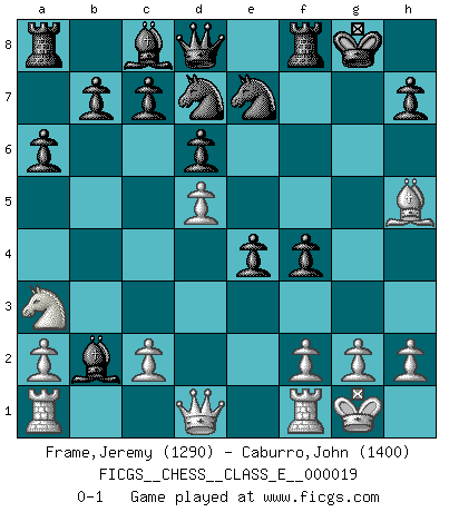 Last move : 0-1 2006 October 31 14:22:26 [Event "FICGS__CHESS__CLASS_E__000019"] [Site "FICGS"] [Date "2006.10.25"] [Round "1"] [White "Frame,Jeremy"] [Black "Caburro,John"] [Result "0-1"] [WhiteElo "1290"] [BlackElo "1400"] 1.e4 g6 2.d4 Bg7 3.Nf3 d6 4.Nc3 Nd7 5.Be3 e5 6.d5 Ne7 7.Be2 O-O 8.O-O f5 9.exf5 gxf5 10.Nb5 f4 11.Bd2 a6 12.Na3 e4 13.Nd4 Bxd4 14.Bc3 Bxc3 15.Bh5 Bxb2 0-1 Robatsch (Modern) defense Kingside Castling by player Black (move 7) Kingside Castling by player White (move 8) Player Black won this chess game. Follow this game move after move (download)The boy (then a 12 year old boy named Anatoly Karpov) doesn't have a clue about Chess, and there's no future at all for him in this profession. (Mikhail Botvinnik) Das Schachspiel hat wie die Liebe, die Musik, die Fähigkeit, den Menschen glücklich zu machen. Ich habe ein leises Gefühl des Bedauerns für jeden, der das Schachspiel nicht kennt, so wie ich jeden bedaure, der die Liebe nicht kennt. (Siegbert Tarrasch) ¿Quién es tu oponente esta tarde? Esta tarde mi oponente son las piezas negras. (Akiba Rubinstein) Toutes choses étant égales, c'est la conviction qui gagne. Alliée à une volonté de vaincre, elle sert de détonateur, suscite des idées, disperse les doutes et aide à penser clairement. (Robert Fischer) Heh, heh, heh. Time to abandon ship. (General Grievous in Star Wars ep.3)