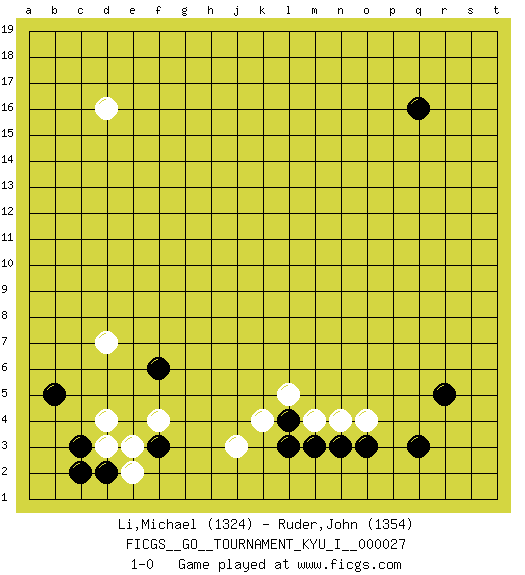Last move : 1-0 2010 May 18 8:24:16 [Event "FICGS__GO__TOURNAMENT_KYU_I__000027"] [Site "FICGS"] [Date "2010.03.31"] [Round "1"] [Black "Li,Michael"] [White "Ruder,John"] [Result "1-0"] [Rating 1 "1324"] [Rating 2 "1354"] 1.q16 d4 2.q3 d16 3.f3 j3 4.f6 d7 5.l3 k4 6.r5 m4 7.m3 n4 8.n3 o4 9.l4 l5 10.o3 f4 11.c3 d3 12.d2 e2 13.c2 e3 14.b5 1-0 This go game has been lost on time (started : 2010.03.31 13:37:43) Here are the names of the openings (joseki) played in the four corners : Corner d4 : d4 f3 Hoshi (Hwajeom, Seongjeom, Xingwei`) 4-4 Point. The star or hoshi (4-4) point, emphasizing influence at the potential expense of territory. Ikken Kakari (Hankan Keolch'im, Yi Gua`jiao~, 1-Space Low Approach). Black 2 is the standard approach move to the 4-4. Player Black won this Go (weiqi, baduk) game. Follow this game move after move (download)You can hide nothing on the goban. (Pierre Audouard) The real voyage of discovery consists not in seeking new lands but in seeing with new eyes. (Marcel Proust)