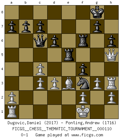 Last move : 0-1 2010 August 19 12:3:51 [Event "FICGS__CHESS__THEMATIC_TOURNAMENT__000110"] [Site "FICGS"] [Date "2010.04.01"] [Round "1"] [White "Dugovic,Daniel"] [Black "Ponting,Andrew"] [Result "0-1"] [WhiteElo "2017"] [BlackElo "1716"] 1.c4 e5 2.Nc3 Nf6 3.Nf3 Nc6 4.g3 Bb4 5.Bg2 Bxc3 6.bxc3 O-O 7.O-O d6 8.d3 e4 9.Ng5 exd3 10.exd3 Bf5 11.Re1 Qd7 12.Ne4 Nxe4 13.Bxe4 Bxe4 14.Rxe4 Rae8 15.Rh4 Ne5 16.Qh5 h6 17.Be3 Qc6 18.Rh3 Nf3+ 19.Kf1 Re5 20.Qg4 f5 21.Qg6 Rf6 22.Qh5 f4 0-1 English Opening Kingside Castling by player Black (move 6) Kingside Castling by player White (move 7) Player Black won this chess game. Follow this game move after move (download)After black's reply to 1.e4 with 1..e5, leaves him always trying to get into the game. (Howard Staunton) Jeder leidlich begabte Spieler, er braucht keineswegs hervorragend veranlagt zu sein, kann es zum Meister bringen. Aber das ist ja auch gar nicht nötig! Der richtige Standpunkt ist es, zu seinem Vergnügen zu spielen, und man glaube ja nicht, dass der Genuss proportional dem Können sei. (Siegbert Tarrasch) Coloca el contenido de las piezas del Ajedrez en un sombrero, agitalo vigorosamente, arrojalas en un tablero desde una altura de 30 centimetros y así obtendras el estilo de Steinitz. (H. E. Bird) On entre au jeu d'Echecs comme on entre en Religion. Pour le joueur d'Echecs, la partie d'Echecs c'est l'office, la messe, le défilé du 1er Mai, le dépôt de gerbe au Monument aux Morts. C'est un drame sacré. (Michel Roos) Treat your password like your toothbrush. Don't let anybody else use it, and get a new one every six months. (Clifford Stoll)