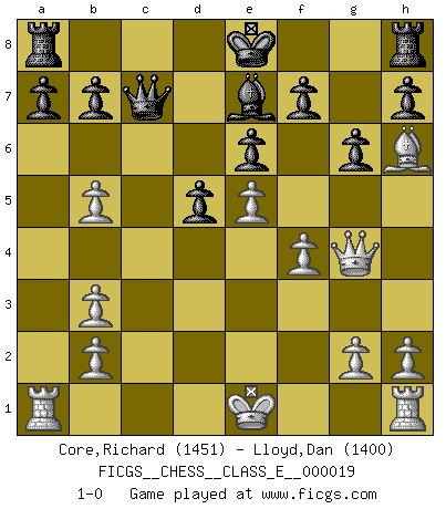 Last move : 1-0 2007 February 15 22:29:16 [Event "FICGS__CHESS__CLASS_E__000019"] [Site "FICGS"] [Date "2006.10.25"] [Round "1"] [White "Core,Richard"] [Black "Lloyd,Dan"] [Result "1-0"] [WhiteElo "1451"] [BlackElo "1400"] 1.Nf3 d5 2.d4 e6 3.e3 Nf6 4.Nbd2 c5 5.Bb5+ Bd7 6.a4 Be7 7.Ne5 Bxb5 8.axb5 Nbd7 9.Nb3 cxd4 10.exd4 Bd6 11.Bg5 Be7 12.Qf3 Nxe5 13.dxe5 Nd7 14.Bf4 Nc5 15.Qg4 g6 16.Bh6 Nxb3 17.cxb3 Qc7 18.f4 1-0 This chess game has been lost on time (started : 2006.10.25 2:8:4) Reti Opening Player White won this chess game. Follow this game move after move (download)Why must I lose to this idiot ? (Aron Nimzovich) Mutter, ich bin eben Ex-Weltmeister geworden. --beim nach Hause Kommen nach dem Verlust des WM-Titels an Mihail Botvinnik -- (Mikhail Nekhemyevich Tal) El Ajedrez es parte de la cultura, y si una cultura esta en decadencia, entonces también el Ajedrez declinará. (Mikhail Botvinnik) Psychologiquement, tu dois avoir confiance en toi même, mais cette confiance doit être basée sur des faits. (Robert Fischer) The intuitive mind is a sacred gift; the rational mind is a faithful servant. We have created a society that honors the servant but has forgotten the gift. (Albert Einstein)