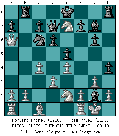 Last move : 0-1 2010 May 24 14:16:16 [Event "FICGS__CHESS__THEMATIC_TOURNAMENT__000110"] [Site "FICGS"] [Date "2010.04.01"] [Round "1"] [White "Ponting,Andrew"] [Black "Hase,Pavel"] [Result "0-1"] [WhiteElo "1716"] [BlackElo "2196"] 1.c4 e5 2.Nc3 d6 3.g3 g6 4.Bg2 Bg7 5.e4 Nc6 6.Nge2 h5 7.O-O Be6 8.d3 h4 9.Qb3 Qd7 10.Qxb7 Rb8 11.Qa6 Nge7 12.Nd5 Bh3 13.Nxe7 Bxg2 0-1 English Opening Kingside Castling by player White (move 7) Player Black won this chess game. Follow this game move after move (download)Fischer sacrificed virtually everything most of us weakies (to use his term) value, respect, and cherish, for the sake of an artful, often beautiful board game, for the ambivalent privilege of being its greatest master. (Paul Kollar) Das Schachspiel übertrifft alle anderen Spiele so weit wie der Chimborasso einen Misthaufen. (Arthur Schopenhauer) Me dio la sensación de como si yo estuviera jugando en contra del mismo Ajedrez. - al estar jugando en contra de Robert Fischer (Walter Shipman) Avec des compensations pour le matériel en plus... (Anonyme) If you don't practice you don't deserve to win. (Andre Agassi)