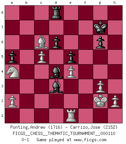 Last move : 0-1 2010 November 23 22:38:22 [Event "FICGS__CHESS__THEMATIC_TOURNAMENT__000110"] [Site "FICGS"] [Date "2010.04.01"] [Round "1"] [White "Ponting,Andrew"] [Black "Carrizo,Jose"] [Result "0-1"] [WhiteElo "1716"] [BlackElo "2152"] 1.c4 e5 2.Nc3 d6 3.g3 f5 4.Bg2 Nf6 5.d3 Be7 6.e4 c6 7.Nge2 O-O 8.O-O Na6 9.f4 fxe4 10.dxe4 Qb6+ 11.Kh1 Ng4 12.Qe1 Nc5 13.Qd1 Nd7 14.Qe1 Ne3 15.Bxe3 Qxe3 16.Rd1 Nf6 17.f5 a6 18.Nc1 Qxe1 19.Rfxe1 b5 20.b3 Nd7 21.Nd3 bxc4 22.bxc4 Rb8 23.Rb1 Rxb1 24.Rxb1 a5 25.Bf1 g6 26.fxg6 hxg6 27.Bh3 Bg5 28.Kg2 Be3 29.Na4 Kg7 30.Rf1 Re8 31.Re1 Bd4 32.c5 Ba6 33.Bxd7 Rd8 34.Bxc6 Bxd3 0-1 This chess game has been lost on time (started : 2010.04.01 3:54:37) English Opening Kingside Castling by player Black (move 7) Kingside Castling by player White (move 8) Player Black won this chess game. Follow this game move after move (download)He who fears an isolated Queen's Pawn should give up Chess. (Siegbert Tarrasch) Schach ist ein Teil der Kultur, und wenn es mit der Kultur abwärts geht, geht es auch mit dem Schach abwärts. (Mikhail Moiseyevich Botvinik) El Ajedrez es un expediente tonto que hace creer a la gente inactiva que hacen una cosa muy astuta cuando solamente estan perdiendo su tiempo. (George Bernard Shaw) Vous m'avez demandé de vous exposer quel est le fondement de la prière. Je ne fais que préparer les pièces du jeu sur la table... Nous sera-t-il permis d'en adopter les règles et si nous les appliquons scrupuleusement nous ne tarderons pas à faire mat le Roi divin ! Il ne pourra échapper à nos mains. (Sainte Thérèse d'Avila, Chemin de perfection) Empty your mind, be formless, shapeless — like water. (Bruce Lee)