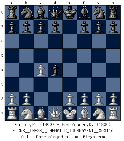 Last move : 0-1 2010 May 16 8:25:23 [Event "FICGS__CHESS__THEMATIC_TOURNAMENT__000110"] [Site "FICGS"] [Date "2010.04.01"] [Round "1"] [White "Valzer,Patrick"] [Black "Ben Younes,Djamel"] [Result "0-1"] [WhiteElo "1800"] [BlackElo "1800"] 1.c4 e5 2.d4 exd4 0-1 This chess game has been lost on time (started : 2010.04.01 3:54:37) English Opening Player Black won this chess game. Follow this game move after move (download)There is only one thing Fischer does in Chess without pleasure: to lose ! (Boris Spassky) Unter Putin wird alles Geld aus Russland wie von einem Staubsauger nach Moskau umgeleitet, das ist wie ein schwarzes Loch. (Garry Kasparov) El pensamiento metódico es mas útil en el Ajedrez que la inspiración. (C. J. S. Purdy) Les Echecs ont trois composantes : le temps, l'espace et le matériel en dernier. (Mikhail Tal) Luck is what you have left over after you give 100 percent. (Langston Coleman)