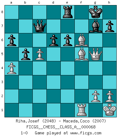 Last move : 1-0 2010 August 9 10:18:44 [Event "FICGS__CHESS__CLASS_A__000068"] [Site "FICGS"] [Date "2010.04.01"] [Round "1"] [White "Riha,Josef"] [Black "Maceda,Coco"] [Result "1-0"] [WhiteElo "2048"] [BlackElo "2007"] 1.e4 c5 2.Nf3 d6 3.d4 cxd4 4.Nxd4 Nf6 5.Nc3 a6 6.f4 e5 7.Nf3 Nbd7 8.a4 Be7 9.Bd3 O-O 10.O-O exf4 11.Bxf4 Qb6+ 12.Kh1 Qxb2 13.Nd5 Nxd5 14.exd5 Nf6 15.c4 Qb6 16.Qd2 Re8 17.Be3 Qc7 18.Bd4 Bg4 19.Nh4 Bh5 20.Rxf6 Bg6 21.Nf5 Bf8 22.Rf1 b5 23.Qf4 gxf6 24.Bxf6 Re6 25.dxe6 fxe6 26.Be4 Re8 27.c5 Bxf5 28.Qg5+ Bg7 29.Bxf5 1-0 This chess game has been lost on time (started : 2010.04.01 18:58:28) Sicilian : Najdorf, 6.f4 Kingside Castling by player Black (move 9) Kingside Castling by player White (move 10) Player White won this chess game. Follow this game move after move (download)My style is somewhere between that of Tal and Petrosian. (Reshevsky) Charakterschwächen offenbaren sich normalerweise während einer Schachpartie. (Garry Kasparov) Debes de llevar a tu oponente hacia un profundo y obscuro bosque donde 2+2=5, y el camino que conduce a la salida es suficientemente ancho para solamente uno. (Mikhail Tal) Fischer est le meilleur joueur du monde et Karpov n'est qu'un joueur de bistrot. (Garry Kasparov, agé de 16 ans) Nowadays, anyone who cannot speak English and is incapable of using the Internet is regarded as backward. (Al-Waleed bin Talal)