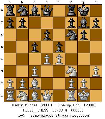 Last move : 1-0 2010 June 3 8:56:29 [Event "FICGS__CHESS__CLASS_A__000068"] [Site "FICGS"] [Date "2010.04.01"] [Round "1"] [White "Aladin,Michel"] [Black "Cherng,Cary"] [Result "1-0"] [WhiteElo "2000"] [BlackElo "2000"] 1.e4 c5 2.Nf3 d6 3.c3 Nf6 4.h3 g6 5.Bd3 Bg7 6.O-O O-O 7.Bc2 e5 8.d4 1-0 This chess game has been lost on time (started : 2010.04.01 18:58:28) Sicilian Kingside Castling by player White (move 6) Kingside Castling by player Black (move 6) Player White won this chess game. Follow this game move after move (download)Chess is a terrible game. If you have no center, your opponent has a freer position. If you do have a center, then you really have something to worry about ! (Siegbert Tarrasch) Pläne sind die Träume des Verständigen. (Ernst Freiherr von Feuchtersleben) Bendita sea la memoria de aquel que dio al mundo este juego inmortal. (A. G. Gardiner) Il vaut mieux sacrifier les pièces de l'adversaire. (Xavier Tartacover) I would love to change the world, but they won't give me the source code. (Unknown)