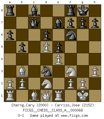 Last move : 0-1 2010 June 19 8:57:26 [Event "FICGS__CHESS__CLASS_A__000068"] [Site "FICGS"] [Date "2010.04.01"] [Round "1"] [White "Cherng,Cary"] [Black "Carrizo,Jose"] [Result "0-1"] [WhiteElo "2000"] [BlackElo "2152"] 1.e4 e5 2.Nf3 Nc6 3.Bb5 a6 4.Ba4 Nf6 5.O-O Be7 6.Re1 b5 7.Bb3 d6 8.c3 O-O 9.h3 Na5 10.Bc2 c5 11.d4 Qc7 12.Nbd2 cxd4 13.cxd4 Nc6 14.d5 Nb4 15.Bb3 Nd3 0-1 Ruy Lopez : Closed Kingside Castling by player White (move 5) Kingside Castling by player Black (move 8) Player Black won this chess game. Follow this game move after move (download)You can only get good at Chess if you love the game. (Bobby Fischer) Als ich elf wurde, wurde ich einfach gut. (Robert James Fischer) El Ajedrez lo es todo: arte, ciencia y deporte. (Anatoly Karpov) Le succès, c'est être capable d'aller d'échec en échec sans perdre son enthousiasme. (Winston Churchill) You think that education is too expensive ? Try ignorance. (Derek Bok)