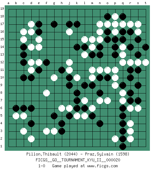 Last move : 1-0 2010 April 23 16:6:40 [Event "FICGS__GO__TOURNAMENT_KYU_II__000020 "] [Site "FICGS"] [Date "2010.04.02"] [Round "1"] [Black "Pillon,Thibault "] [White "Praz,Sylvain "] [Result "1-0"] [Rating 1 "2044"] [Rating 2 "1598"] 1.q16 d17 2.d4 r3 3.d15 c15 4.c14 c16 5.q4 r4 6.q5 p2 7.n4 d14 8.c13 e14 9.c10 o17 10.k17 q14 11.g17 f3 12.d6 d2 13.h3 g3 14.h4 c3 15.g5 r17 16.p15 q17 17.p14 q13 18.r16 n15 19.o16 n16 20.p17 p18 21.o18 n17 22.q18 p16 23.q3 p17 24.q2 q7 25.q15 s6 26.r11 p11 27.p13 q12 28.s13 s14 29.s15 s12 30.t14 r12 31.r14 n7 32.e16 e15 33.e17 d16 34.f12 e12 35.e11 d12 36.c12 d11 37.d10 r2 38.q1 b5 39.b6 c5 40.c6 s17 41.n13 n11 42.o10 o11 43.n10 m10 44.m9 m11 45.n8 o7 46.q9 k5 47.r7 r6 48.q6 q8 49.r8 r9 50.r10 p9 51.s9 p10 52.s11 t12 53.s7 s16 54.n14 l13 55.l14 l15 56.k14 f8 57.l9 j16 58.j17 m14 59.m13 m15 60.o15 k10 61.k7 l7 62.k8 h6 63.j10 j11 64.j9 g10 65.h11 j12 66.l6 m6 67.k6 l5 68.j5 j6 69.m5 1-0 Here are the names of the openings (joseki) played in the four corners : Corner d16 : d17 d15Komoku (Somok, Xiao~mu`) 3-4 Point. The komoku (3-4) point is the traditional corner enclosure move..Ikken Takagakari (Hankan Nop'dakeolch'im, Yi Gaogua`jiao~, 1-Space High Approach). The 5-4 approach move has become more popular in modern times, as modern Go emphasizes speed and influence. Corner q4 : r3 q4San-San (Sam-Sam, San-San) 3-3 Point. The San-San (3-3) point, emphasizing territory at the expense of influence.Kata-tsuki (shoulder hit). The shoulder-hit is the traditional answer to the 3-3. The direction of White 3 depends on the positions on the side. Crawling once may be the premise for a follow-up move of sliding with a knight's move in the opposite direction. If White plays 3 at 3-4 (to the right), the follow-on knight's move is then played at the top (e.g. 3-4, 4-5, 5-2). White's knight's move reduces territory potential on the side it is played. Corner q16 : q16 o17Hoshi (Hwajeom, Seongjeom, Xingwei`) 4-4 Point. The star or hoshi (4-4) point, emphasizing influence at the potential expense of territory.Ikken Kakari (Hankan Keolch'im, Yi Gua`jiao~, 1-Space Low Approach). White 2 is the standard approach move to the 4-4. Corner d4 : d4 f3Hoshi (Hwajeom, Seongjeom, Xingwei`) 4-4 Point. The star or hoshi (4-4) point, emphasizing influence at the potential expense of territory.Ikken Kakari (Hankan Keolch'im, Yi Gua`jiao~, 1-Space Low Approach). White 2 is the standard approach move to the 4-4. Player Black won this Go (weiqi, baduk) game.Follow this game move after move (download ) The strong player plays straight, the weak diagonally. (Anonymous) For a mechanic, you seem to do an excessive amount of thinking. (C-3PO in Star Wars ep.2)