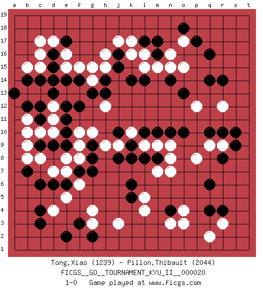 Last move : 1-0 2010 July 3 1:29:38 [Event "FICGS__GO__TOURNAMENT_KYU_II__000020"] [Site "FICGS"] [Date "2010.04.02"] [Round "1"] [Black "Tong,Xiao"] [White "Pillon,Thibault"] [Result "1-0"] [Rating 1 "1239"] [Rating 2 "2044"] 1.q16 d4 2.q4 d17 3.d15 c15 4.d16 c16 5.e17 c17 6.d14 c13 7.e12 o3 8.q6 q2 9.q10 o17 10.m17 o15 11.q14 l16 12.l17 k16 13.m16 m15 14.p17 n16 15.o18 h12 16.f3 r3 17.c6 e5 18.c3 g4 19.c4 d7 20.e2 g3 21.g2 j3 22.r4 r12 23.r14 p12 24.n14 n15 25.s10 r9 26.r10 p8 27.o10 n8 28.r8 q9 29.s9 k17 30.n4 n3 31.m8 n7 32.m10 m7 33.o13 o4 34.l14 l15 35.k14 h15 36.h14 g14 37.h13 f15 38.g13 e16 39.j15 h16 40.l8 f13 41.f12 e13 42.d13 d12 43.c12 d11 44.c14 b13 45.b14 b15 46.b12 b11 47.c11 c10 48.a13 e15 49.j16 b10 50.e14 j17 51.f14 g15 52.d9 d10 53.e9 c8 54.c9 b9 55.b7 b8 56.k6 l5 57.k5 l4 58.d6 e7 59.e6 f6 60.f7 f8 61.g7 f10 62.g8 f9 63.e11 h9 64.e10 e8 65.j8 j9 66.k8 n9 67.n10 m9 68.l10 l9 69.k9 k10 70.g9 g10 71.j10 1-0 Here are the names of the openings (joseki) played in the four corners : Corner d16 : d17 d15 Komoku (Somok, Xiao~mu`) 3-4 Point. The komoku (3-4) point is the traditional corner enclosure move.. Ikken Takagakari (Hankan Nop'dakeolch'im, Yi Gaogua`jiao~, 1-Space High Approach). The 5-4 approach move has become more popular in modern times, as modern Go emphasizes speed and influence. Corner q4 : q4 o3 Hoshi (Hwajeom, Seongjeom, Xingwei`) 4-4 Point. The star or hoshi (4-4) point, emphasizing influence at the potential expense of territory. Ikken Kakari (Hankan Keolch'im, Yi Gua`jiao~, 1-Space Low Approach). White 2 is the standard approach move to the 4-4. Corner q16 : q16 o17 Hoshi (Hwajeom, Seongjeom, Xingwei`) 4-4 Point. The star or hoshi (4-4) point, emphasizing influence at the potential expense of territory. Ikken Kakari (Hankan Keolch'im, Yi Gua`jiao~, 1-Space Low Approach). White 2 is the standard approach move to the 4-4. Corner d4 : d4 f3 Hoshi (Hwajeom, Seongjeom, Xingwei`) 4-4 Point. The star or hoshi (4-4) point, emphasizing influence at the potential expense of territory. Ikken Kakari (Hankan Keolch'im, Yi Gua`jiao~, 1-Space Low Approach). Black 2 is the standard approach move to the 4-4. Player Black won this Go (weiqi, baduk) game. Follow this game move after move (download)Take the cutting stone on the second line. (Anonymous) Dave, my mind is going. I can feel it. (HAL 9000 in 2001, a space odyssey)