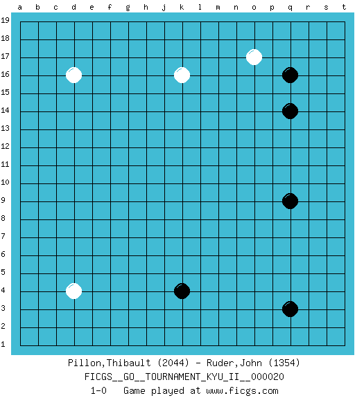 Last move : 1-0 2010 May 11 7:50:19 [Event "FICGS__GO__TOURNAMENT_KYU_II__000020"] [Site "FICGS"] [Date "2010.04.02"] [Round "1"] [Black "Pillon,Thibault"] [White "Ruder,John"] [Result "1-0"] [Rating 1 "2044"] [Rating 2 "1354"] 1.q16 d4 2.q3 d16 3.q9 o17 4.q14 k16 5.k4 1-0 This go game has been lost on time (started : 2010.04.02 13:26:33) Here are the names of the openings (joseki) played in the four corners : Corner q16 : q16 o17 Hoshi (Hwajeom, Seongjeom, Xingwei`) 4-4 Point. The star or hoshi (4-4) point, emphasizing influence at the potential expense of territory. Ikken Kakari (Hankan Keolch'im, Yi Gua`jiao~, 1-Space Low Approach). White 2 is the standard approach move to the 4-4. Player Black won this Go (weiqi, baduk) game. Follow this game move after move (download)The intersection is rarely neutral. (Pierre Audouard) Computer Science is no more about computers than astronomy is about telescopes. (Edsger W. Dijkstra)