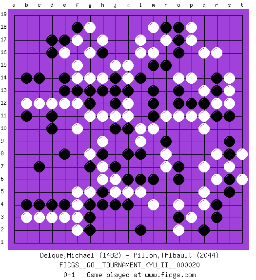 Last move : 0-1 2010 August 24 9:38:33 [Event "FICGS__GO__TOURNAMENT_KYU_II__000020"] [Site "FICGS"] [Date "2010.04.02"] [Round "1"] [Black "Delque,Michael"] [White "Pillon,Thibault"] [Result "0-1"] [Rating 1 "1482"] [Rating 2 "2044"] 1.d4 q16 2.d16 q4 3.d10 q10 4.k4 f17 5.d17 f15 6.e14 l16 7.k10 d3 8.c4 e3 9.e4 f4 10.g3 f3 11.g4 f5 12.c7 c3 13.b4 b3 14.g2 f2 15.o3 m4 16.q2 o4 17.r3 p3 18.r4 q5 19.s6 c12 20.c14 e12 21.f13 f12 22.h13 f10 23.b11 b12 24.d11 d12 25.e8 j11 26.g12 g11 27.h16 f14 28.e13 h14 29.f16 g16 30.g17 e16 31.f18 h17 32.e17 g18 33.j12 k11 34.j14 j15 35.j10 h11 36.m13 k12 37.k13 r16 38.b14 g5 39.h5 q13 40.o6 o2 41.l2 q7 42.m6 l10 43.k8 l5 44.n9 n11 45.o12 o11 46.o16 o14 47.o13 p14 48.q12 p11 49.p12 l9 50.l6 k5 51.k6 j5 52.j4 h6 53.h4 j6 54.j7 g8 55.l8 r12 56.r11 q11 57.r13 s12 58.s11 s13 59.s9 s7 60.t7 t8 61.s8 t6 62.r7 r6 63.t7 g14 64.g13 s7 65.r14 s14 66.t7 k14 67.j13 s7 68.s5 r8 69.l14 k15 70.m15 m16 71.n15 p17 72.o17 m18 73.o18 p18 74.m17 n17 75.n18 l17 76.m11 m10 77.m12 n7 78.o7 n8 79.h8 h9 80.g7 h7 0-1 Here are the names of the openings (joseki) played in the four corners : Corner d16 : d16 f17 Hoshi (Hwajeom, Seongjeom, Xingwei`) 4-4 Point. The star or hoshi (4-4) point, emphasizing influence at the potential expense of territory. Ikken Kakari (Hankan Keolch'im, Yi Gua`jiao~, 1-Space Low Approach). White 2 is the standard approach move to the 4-4. Corner d4 : d4 d3 Hoshi (Hwajeom, Seongjeom, Xingwei`) 4-4 Point. The star or hoshi (4-4) point, emphasizing influence at the potential expense of territory. Corner q4 : q4 o3 Hoshi (Hwajeom, Seongjeom, Xingwei`) 4-4 Point. The star or hoshi (4-4) point, emphasizing influence at the potential expense of territory. Ikken Kakari (Hankan Keolch'im, Yi Gua`jiao~, 1-Space Low Approach). Black 2 is the standard approach move to the 4-4. Player White won this Go (weiqi, baduk) game. Follow this game move after move (download)The comb formation is alive. (Anonymous) Success without honor is an unseasoned dish; it will satisfy your hunger, but it won't taste good. (Joe Paterno)