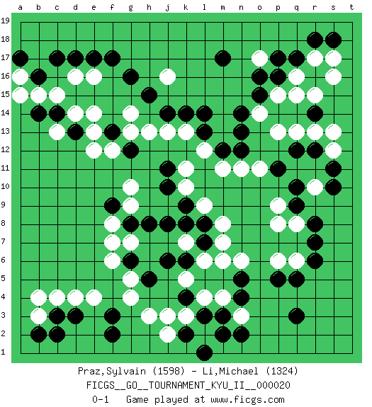 Last move : 0-1 2010 May 11 3:28:25 [Event "FICGS__GO__TOURNAMENT_KYU_II__000020"] [Site "FICGS"] [Date "2010.04.02"] [Round "1"] [Black "Praz,Sylvain"] [White "Li,Michael"] [Result "0-1"] [Rating 1 "1598"] [Rating 2 "1324"] 1.r16 d16 2.q3 d4 3.f17 j16 4.c14 d14 5.d13 e14 6.c17 c15 7.d17 c13 8.f3 h3 9.c3 c4 10.d3 e4 11.f2 g5 12.f9 e12 13.g16 o17 14.m17 r17 15.q17 q16 16.r18 s17 17.p16 q15 18.p17 p15 19.s18 s16 20.o16 r10 21.r7 n3 22.b14 b15 23.f13 e13 24.o15 p13 25.n13 j13 26.j11 f12 27.g12 g14 28.h15 g13 29.j14 k13 30.k14 h13 31.l13 l12 32.m12 k11 33.j10 g10 34.h8 g9 35.g8 f8 36.g6 f7 37.h5 g4 38.j6 f6 39.k4 k3 40.l3 l2 41.k2 j3 42.m2 l4 43.m3 m4 44.n2 k5 45.n4 m6 46.n5 l9 47.k6 l6 48.l7 m7 49.l8 m8 50.k9 k10 51.j8 k7 52.k8 g7 53.r14 r15 54.q12 r13 55.r12 q13 56.p11 p8 57.q9 q8 58.r8 p9 59.q10 p6 60.q5 s12 61.s11 s13 62.s10 b3 63.b2 b4 64.c2 j2 65.l1 m11 66.b16 a16 67.a17 a15 68.p5 q6 69.r6 n11 70.n12 o11 71.l14 o14 72.n14 e16 73.e17 n6 0-1 Here are the names of the openings (joseki) played in the four corners : Corner d16 : d16 f17 Hoshi (Hwajeom, Seongjeom, Xingwei`) 4-4 Point. The star or hoshi (4-4) point, emphasizing influence at the potential expense of territory. Ikken Kakari (Hankan Keolch'im, Yi Gua`jiao~, 1-Space Low Approach). Black 2 is the standard approach move to the 4-4. Corner d4 : d4 f3 Hoshi (Hwajeom, Seongjeom, Xingwei`) 4-4 Point. The star or hoshi (4-4) point, emphasizing influence at the potential expense of territory. Ikken Kakari (Hankan Keolch'im, Yi Gua`jiao~, 1-Space Low Approach). Black 2 is the standard approach move to the 4-4. Corner q16 : r16 o17 Komoku (Somok, Xiao~mu`) 3-4 Point. The komoku (3-4) point is the traditional corner enclosure move.. Niken Kakari (Dukan Keolch'im, E`r Gua`jiao~, 2-Space Low Approach). White 2 is used with friendly forces backing it up. Its purpose is to prevent a pincer. Locally it results in a loss, but may be appropriate fuseki strategy. It was popular in the late 1950s and early 1960s, but is not seen often nowadays, having been replaced by the one-space high approach, with which it has points in common. Player White won this Go (weiqi, baduk) game. Follow this game move after move (download)Play slow, win slow; play fast, lose fast. (Anonymous) Life is painting a picture, not doing a sum. (Oliver Wendell Holmes, Jr.)