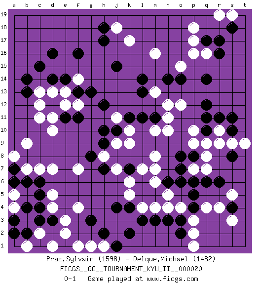 Last move : 0-1 2010 September 20 15:28:5 [Event "FICGS__GO__TOURNAMENT_KYU_II__000020"] [Site "FICGS"] [Date "2010.04.02"] [Round "1"] [Black "Praz,Sylvain"] [White "Delque,Michael"] [Result "0-1"] [Rating 1 "1598"] [Rating 2 "1482"] 1.r16 q4 2.d16 p16 3.d3 d5 4.c5 d4 5.c4 e3 6.c3 f4 7.q14 m16 8.q17 q16 9.r17 p17 10.r6 n4 11.q10 m10 12.h17 d10 13.c15 c7 14.p6 m6 15.h12 d13 16.h10 f14 17.m11 n10 18.l11 o12 19.q12 k9 20.o14 o15 21.n14 n12 22.l14 k17 23.f16 r4 24.b13 c11 25.f11 m13 26.l13 n11 27.g3 e2 28.k7 q8 29.p8 q7 30.q6 p7 31.o7 p9 32.o8 q9 33.o6 p10 34.q11 m8 35.s8 s9 36.s10 r10 37.r11 r9 38.s11 t9 39.p4 p3 40.m5 n5 41.n6 m7 42.o3 o4 43.p5 p2 44.n3 m4 45.s4 s3 46.l5 s5 47.m3 l4 48.l3 k5 49.l6 k6 50.k4 l7 51.j4 h1 52.h2 g1 53.k2 b7 54.b6 b1 55.c6 d7 56.a7 a8 57.a6 b9 58.c1 c2 59.b2 d1 60.a2 a4 61.b4 a5 62.a3 j11 63.j10 k10 64.k11 j9 65.h9 h8 66.g8 f7 67.d12 c12 68.e14 e13 69.f13 f12 70.g13 e12 71.d14 c13 72.b14 j18 73.h18 p18 74.j15 s19 75.s18 r19 76.o2 p1 77.j1 f1 78.h7 j7 79.e11 d11 0-1 Here are the names of the openings (joseki) played in the four corners : Corner q16 : r16 p16 Komoku (Somok, Xiao~mu`) 3-4 Point. The komoku (3-4) point is the traditional corner enclosure move.. Ikken Takagakari (Hankan Nop'dakeolch'im, Yi Gaogua`jiao~, 1-Space High Approach). The 5-4 approach move has become more popular in modern times, as modern Go emphasizes speed and influence. Corner d4 : d3 d5 Komoku (Somok, Xiao~mu`) 3-4 Point. The komoku (3-4) point is the traditional corner enclosure move.. Ikken Takagakari (Hankan Nop'dakeolch'im, Yi Gaogua`jiao~, 1-Space High Approach). The 5-4 approach move has become more popular in modern times, as modern Go emphasizes speed and influence. Corner q4 : q4 r6 Hoshi (Hwajeom, Seongjeom, Xingwei`) 4-4 Point. The star or hoshi (4-4) point, emphasizing influence at the potential expense of territory. Ikken Kakari (Hankan Keolch'im, Yi Gua`jiao~, 1-Space Low Approach). Black 2 is the standard approach move to the 4-4. Player White won this Go (weiqi, baduk) game. Follow this game move after move (download)The second line is the line of defeat, the third line is the line of territory, and the fourth line is the line of influence. (Anonymous) Two beer, or not two beer. (Unknown)