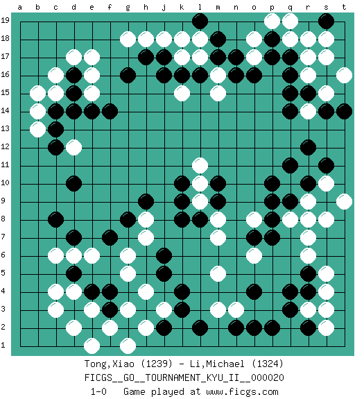 Last move : 1-0 2010 May 15 19:31:22 [Event "FICGS__GO__TOURNAMENT_KYU_II__000020"] [Site "FICGS"] [Date "2010.04.02"] [Round "1"] [Black "Tong,Xiao"] [White "Li,Michael"] [Result "1-0"] [Rating 1 "1239"] [Rating 2 "1324"] 1.q16 d4 2.q4 d17 3.d15 d12 4.g16 e15 5.e14 e16 6.f14 c15 7.c14 b15 8.d16 c16 9.d14 e17 10.d10 b14 11.c12 b13 12.c13 o17 13.m17 r17 14.q17 r16 15.q15 q18 16.p18 r18 17.p17 r14 18.f3 c6 19.k4 r6 20.o4 q10 21.r8 q8 22.q9 r9 23.p9 r7 24.r10 s8 25.s9 r8 26.q11 r11 27.p10 s10 28.s11 q10 29.r15 s15 30.r10 t9 31.r12 r3 32.r4 s4 33.q3 s2 34.r2 s3 35.q14 g18 36.s14 t16 37.h17 h18 38.j17 j18 39.d3 c3 40.e4 d2 41.e2 e3 42.t14 q19 43.d3 k17 44.k16 l17 45.l16 e3 46.s19 s18 47.d3 o18 48.m18 p19 49.o16 l18 50.d5 c4 51.d7 e3 52.f4 f2 53.g2 e1 54.o7 m7 55.m9 l9 56.l8 m8 57.k9 l10 58.k10 o8 59.p8 o6 60.p7 m5 61.m10 l11 62.k8 m3 63.n2 n3 64.o2 h2 65.h3 g1 66.j2 g3 67.l2 h4 68.j5 j3 69.k3 g6 70.g8 e6 71.f7 d6 72.p2 h7 73.j6 g5 74.r5 s5 75.s16 s17 76.c8 m16 77.n16 m15 78.l19 k18 79.n17 k15 80.j16 h8 81.h9 1-0 Here are the names of the openings (joseki) played in the four corners : Corner d16 : d17 d15 Komoku (Somok, Xiao~mu`) 3-4 Point. The komoku (3-4) point is the traditional corner enclosure move.. Ikken Takagakari (Hankan Nop'dakeolch'im, Yi Gaogua`jiao~, 1-Space High Approach). The 5-4 approach move has become more popular in modern times, as modern Go emphasizes speed and influence. Corner q16 : q16 o17 Hoshi (Hwajeom, Seongjeom, Xingwei`) 4-4 Point. The star or hoshi (4-4) point, emphasizing influence at the potential expense of territory. Ikken Kakari (Hankan Keolch'im, Yi Gua`jiao~, 1-Space Low Approach). White 2 is the standard approach move to the 4-4. Corner d4 : d4 f3 Hoshi (Hwajeom, Seongjeom, Xingwei`) 4-4 Point. The star or hoshi (4-4) point, emphasizing influence at the potential expense of territory. Ikken Kakari (Hankan Keolch'im, Yi Gua`jiao~, 1-Space Low Approach). Black 2 is the standard approach move to the 4-4. Corner q4 : q4 r6 Hoshi (Hwajeom, Seongjeom, Xingwei`) 4-4 Point. The star or hoshi (4-4) point, emphasizing influence at the potential expense of territory. Ikken Kakari (Hankan Keolch'im, Yi Gua`jiao~, 1-Space Low Approach). White 2 is the standard approach move to the 4-4. Player Black won this Go (weiqi, baduk) game. Follow this game move after move (download)I really believe that Go is destined to take the place of Chess as the leading intellectual game of the Occident, just as it has reigned supreme in the Orient for some four thousand years. (Edward Lasker, international chess master) Life is the sum of all your choices. (Albert Camus)