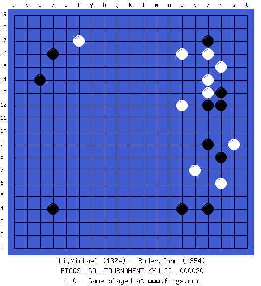 Last move : 1-0 2010 May 16 8:25:23 [Event "FICGS__GO__TOURNAMENT_KYU_II__000020 "] [Site "FICGS"] [Date "2010.04.02"] [Round "1"] [Black "Li,Michael "] [White "Ruder,John "] [Result "1-0"] [Rating 1 "1324"] [Rating 2 "1354"] 1.q17 r15 2.q4 o16 3.d4 q16 4.d16 f17 5.c14 r6 6.q9 p7 7.r12 q13 8.r13 q14 9.o4 s9 10.q12 o12 11.r8 1-0 This go game has been lost on time (started : 2010.04.02 13:26:33) Here are the names of the openings (joseki) played in the four corners : Corner q16 : q17 r15Komoku (Somok, Xiao~mu`) 3-4 Point. The komoku (3-4) point is the traditional corner enclosure move..Ikken Kakari (Hankan Keolch'im, Yi Gua`jiao~, 1-Space Low Pincer). The small knight move is the basic approach move to the 3-4 point stone. It has been continually used for over four centuries. There are limitless variations, with new moves constantly being discovered. White 2 opens the door to a treaure store of joseki. Corner d16 : d16 f17Hoshi (Hwajeom, Seongjeom, Xingwei`) 4-4 Point. The star or hoshi (4-4) point, emphasizing influence at the potential expense of territory.Ikken Kakari (Hankan Keolch'im, Yi Gua`jiao~, 1-Space Low Approach). White 2 is the standard approach move to the 4-4. Corner q4 : q4 r6Hoshi (Hwajeom, Seongjeom, Xingwei`) 4-4 Point. The star or hoshi (4-4) point, emphasizing influence at the potential expense of territory.Ikken Kakari (Hankan Keolch'im, Yi Gua`jiao~, 1-Space Low Approach). White 2 is the standard approach move to the 4-4. Player Black won this Go (weiqi, baduk) game.Follow this game move after move (download ) Play slow, win slow; play fast, lose fast. (Anonymous) Establishing goals is all right if you don't let them deprive you of interesting detours. (Doug Larson)