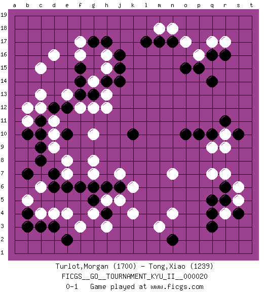 Last move : 0-1 2010 May 19 19:9:7 [Event "FICGS__GO__TOURNAMENT_KYU_II__000020"] [Site "FICGS"] [Date "2010.04.02"] [Round "1"] [Black "Turlot,Morgan"] [White "Tong,Xiao"] [Result "0-1"] [Rating 1 "1700"] [Rating 2 "1239"] 1.r16 d4 2.q3 d16 3.q10 o17 4.o15 q17 5.q16 p16 6.p15 r17 7.q14 n4 8.q5 k4 9.n17 n18 10.m17 m18 11.l17 f17 12.k10 g4 13.c3 c4 14.d3 f3 15.b4 b5 16.b3 c6 17.e2 c15 18.c10 c12 19.e10 g10 20.c8 r7 21.r6 q7 22.o10 r10 23.r11 q9 24.s10 r9 25.p10 r4 26.q4 s6 27.r5 s5 28.s4 n7 29.h17 h16 30.j16 h15 31.g17 f16 32.j15 h13 33.h14 g14 34.j14 e8 35.d7 e7 36.d6 e4 37.e6 g7 38.n2 m3 39.d12 c13 40.g13 h12 41.f13 g12 42.f15 f12 43.e12 e13 44.f14 d9 45.c9 d10 46.f6 g8 47.b7 b11 48.c11 d11 49.b10 b12 50.g5 h5 51.h4 h3 52.h6 j5 53.g6 j7 54.j6 k6 0-1 Here are the names of the openings (joseki) played in the four corners : Corner q16 : r16 o17 Komoku (Somok, Xiao~mu`) 3-4 Point. The komoku (3-4) point is the traditional corner enclosure move.. Niken Kakari (Dukan Keolch'im, E`r Gua`jiao~, 2-Space Low Approach). White 2 is used with friendly forces backing it up. Its purpose is to prevent a pincer. Locally it results in a loss, but may be appropriate fuseki strategy. It was popular in the late 1950s and early 1960s, but is not seen often nowadays, having been replaced by the one-space high approach, with which it has points in common. Corner q4 : q3 n4 Komoku (Somok, Xiao~mu`) 3-4 Point. The komoku (3-4) point is the traditional corner enclosure move.. Player White won this Go (weiqi, baduk) game. Follow this game move after move (download)In opponents' sphere of influence, avoid sharp conflict, don't move too deep. (Otake Hideo, 9p) The leaves of memory seemed to make a mournful rustling in the dark. (Henry Wadsworth Longfellow)