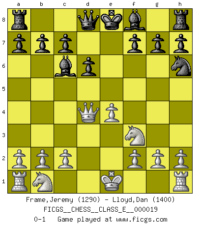 Last move : 0-1 2006 October 28 13:1:38 [Event "FICGS__CHESS__CLASS_E__000019"] [Site "FICGS"] [Date "2006.10.25"] [Round "1"] [White "Frame,Jeremy"] [Black "Lloyd,Dan"] [Result "0-1"] [WhiteElo "1290"] [BlackElo "1400"] 1.e4 e5 2.Nf3 d6 3.d4 exd4 4.Qxd4 Nc6 5.Bb5 Bd7 6.Bxc6 Bxc6 7.Bh6 Nxh6 0-1 Philidor : Exchange variation Player Black won this chess game. Follow this game move after move (download)By playing at Chess then, we may learn: First: Foresight... Second: Circumspection... Third: Caution... And lastly, we learn by Chess the habit of not being discouraged by present bad appearances in the state of our affairs, the habit of hoping for a favorable chance, and that of persevering in the secrets of resources. (Benjamin Franklin) Charakterschwächen offenbaren sich normalerweise während einer Schachpartie. (Garry Kasparov) Debes de llevar a tu oponente hacia un profundo y obscuro bosque donde 2+2=5, y el camino que conduce a la salida es suficientemente ancho para solamente uno. (Mikhail Tal) Si je n'étais pas joueur d'échecs, je serais le meilleur dans quelque chose d'autre. (Anatoli Karpov) The Internet is so big, so powerful and pointless that for some people it is a complete substitute for life. (Andrew Brown)
