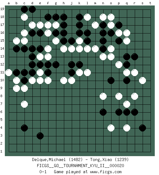Last move : 0-1 2010 May 22 7:30:30 [Event "FICGS__GO__TOURNAMENT_KYU_II__000020"] [Site "FICGS"] [Date "2010.04.02"] [Round "1"] [Black "Delque,Michael"] [White "Tong,Xiao"] [Result "0-1"] [Rating 1 "1482"] [Rating 2 "1239"] 1.d16 q4 2.c4 q16 3.e3 d10 4.d12 c7 5.k17 o17 6.q10 f17 7.g18 d17 8.e16 e17 9.f18 c16 10.d14 c15 11.e14 g17 12.h18 g15 13.g12 k15 14.r6 l18 15.k18 m17 16.l16 m14 17.l15 l14 18.j15 j14 19.n16 o14 20.n17 n18 21.o16 p16 22.n14 n13 23.n15 o13 24.h15 h14 25.k16 k14 26.h17 e11 27.e12 h10 28.f11 f10 29.d11 e10 30.b11 b10 31.c10 c9 32.c11 o4 33.s4 r8 34.p6 p8 35.q13 s10 36.o10 n8 37.n6 q7 38.q6 r11 39.p15 q15 40.g16 f16 41.h16 f14 42.r13 p12 43.q12 q11 44.p17 o18 45.c19 c18 46.d19 f13 47.f12 b9 48.c14 b15 49.b14 e13 50.j12 k11 51.k12 l11 52.j11 j10 53.d13 a11 0-1 Here are the names of the openings (joseki) played in the four corners : Corner q4 : q4 r6 Hoshi (Hwajeom, Seongjeom, Xingwei`) 4-4 Point. The star or hoshi (4-4) point, emphasizing influence at the potential expense of territory. Ikken Kakari (Hankan Keolch'im, Yi Gua`jiao~, 1-Space Low Approach). Black 2 is the standard approach move to the 4-4. Player White won this Go (weiqi, baduk) game. Follow this game move after move (download)Go uses the most elemental materials and concepts - line and circle, wood and stone, black and white - combining them with simple rules to generate subtle strategies and complex tactics that stagger the imagination. (Iwamoto Kaoru, 9 dan professional Go player and former Honinbo title holder) Waiting for chance ? Play in casinos. (FICGS proverb)