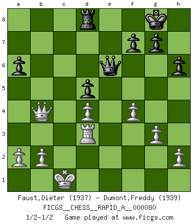 Last move : 1/2-1/2 2010 June 27 19:35:12 [Event "FICGS__CHESS__RAPID_A__000080"] [Site "FICGS"] [Date "2010.04.02"] [Round "1"] [White "Faust,Dieter"] [Black "Dumont,Freddy"] [Result "1/2-1/2"] [WhiteElo "1937"] [BlackElo "1939"] 1.d4 Nf6 2.c4 c6 3.Nc3 d5 4.Nf3 e6 5.Bg5 Nbd7 6.cxd5 exd5 7.e3 Bd6 8.Bd3 Nf8 9.Qc2 Ng6 10.Nh4 O-O 11.O-O-O Nxh4 12.Bxh4 h6 13.e4 dxe4 14.Nxe4 Be7 15.Rhe1 Nxe4 16.Bxe7 Qxe7 17.Rxe4 Qf6 18.g3 Bf5 19.Re5 Bxd3 20.Rxd3 Rad8 21.f4 Rd5 22.Qa4 a6 23.Rxd5 cxd5 24.Qd7 Rd8 25.Qxb7 Qe6 26.Qb4 1/2-1/2 Queen's pawn game Kingside Castling by player Black (move 10) Queenside Castling by player White (move 11) This chess game ended in a draw. Follow this game move after move (download)Before the endgame, the Gods have placed the middle game. (Siegbert Tarrasch) Die starken Figuren des Gegners muss man abtauschen. (José Raúl Capablanca) El Ajedrez lo es todo: arte, ciencia y deporte. (Anatoly Karpov) Dieu déplace le joueur, et celui-ci la pièce. Quel Dieu derrière Dieu commence donc la trame ? Arturo Perez-Reverte (prix de littérature policière 1993). The intuitive mind is a sacred gift; the rational mind is a faithful servant. We have created a society that honors the servant but has forgotten the gift. (Albert Einstein)