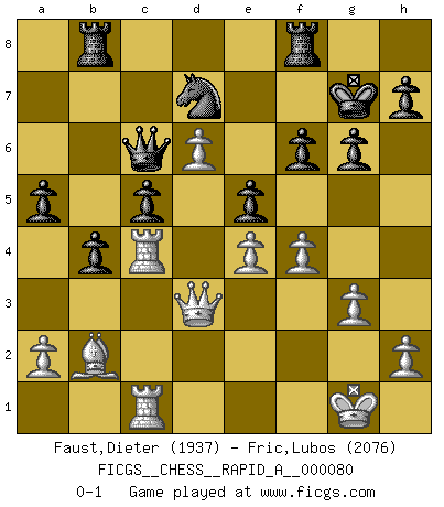 Last move : 0-1 2010 June 19 17:33:2 [Event "FICGS__CHESS__RAPID_A__000080"] [Site "FICGS"] [Date "2010.04.02"] [Round "1"] [White "Faust,Dieter"] [Black "Fric,Lubos"] [Result "0-1"] [WhiteElo "1937"] [BlackElo "2076"] 1.d4 Nf6 2.c4 e6 3.Nf3 d5 4.g3 dxc4 5.Bg2 Nc6 6.O-O Rb8 7.e3 b5 8.b3 Ba6 9.Ne5 Nxe5 10.dxe5 Nd7 11.Bb2 b4 12.bxc4 Bxc4 13.Re1 c5 14.Nd2 Bd5 15.e4 Bc6 16.Nc4 Nb6 17.Nd6+ Bxd6 18.exd6 O-O 19.Qg4 g6 20.Qf4 f6 21.Bh3 e5 22.Qd2 Bd7 23.Bf1 Be6 24.Rac1 Nd7 25.f4 Qb6 26.Bc4 Bxc4 27.Rxc4 Qc6 28.Rec1 a5 29.Qd3 Kg7 0-1 Queen's pawn game Kingside Castling by player White (move 6) Kingside Castling by player Black (move 18) Player Black won this chess game. Follow this game move after move (download)I like to say that Bobby Fischer was the greatest player ever. But what made Fischer a genius was his ability to blend an American freshness and pragmatism with Russian ideas about strategy. (Bruce Pandolfini) Gott hat gewollt, dass ich Champion werde. (Surab Azmajparaschvili) Botvinnik trataba de restarle el misterio al Ajedrez, siempre relacionandolo a situaciones de la vida ordinaria. El gustaba de llamar al Ajedrez un típico problema inexacto similar a aquellos de los cuales la gente siempre tiene que enfrentarse en la vida cotidiana. (Garry Kasparov) La solitude du joueur d'Echecs à l'approche du mat est semblable à celle du condamné. (Francis Szpiner) If you lose the game you should win the analysis! (Proverb)
