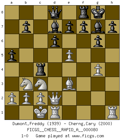 Last move : 1-0 2010 April 13 1:8:36 [Event "FICGS__CHESS__RAPID_A__000080"] [Site "FICGS"] [Date "2010.04.02"] [Round "1"] [White "Dumont,Freddy"] [Black "Cherng,Cary"] [Result "1-0"] [WhiteElo "1939"] [BlackElo "2000"] 1.e4 c5 2.Nf3 d6 3.d4 cxd4 4.Nxd4 Nf6 5.Nc3 g6 6.Be3 Bg7 7.f3 Nc6 8.Qd2 O-O 9.Bc4 Bd7 10.O-O-O Rc8 11.Bb3 Ne5 12.h4 Nc4 13.Bxc4 Rxc4 14.h5 Nxh5 15.g4 Nf6 16.Nb3 a5 17.e5 Nxg4 18.fxg4 1-0 Sicilian : Dragon, Yugoslav attack Kingside Castling by player Black (move 8) Queenside Castling by player White (move 10) Player White won this chess game. Follow this game move after move (download)Your body has to be in top condition. Your Chess deteriorates as your body does. You can't separate body from mind. (Bobby Fischer) Konzentriere dich auf materielle Gewinne. Nimm, was dir dein Gegner gibt, ausser es gibt einen guten Grund der dagegenspricht. (Robert James Fischer) Un mal plan es mejor que no tener ningún plan. (Frank Marshall) On n'a jamais que l'âge auquel on a commence à jouer aux échecs car après on cesse de vieillir. (Capablanca) The Internet isn't free. It just has an economy that makes no sense to capitalism. (Brad Shapcott)
